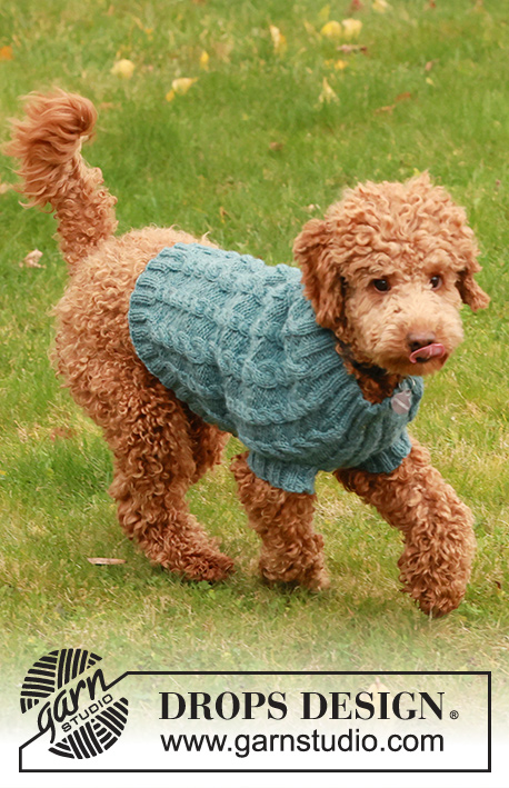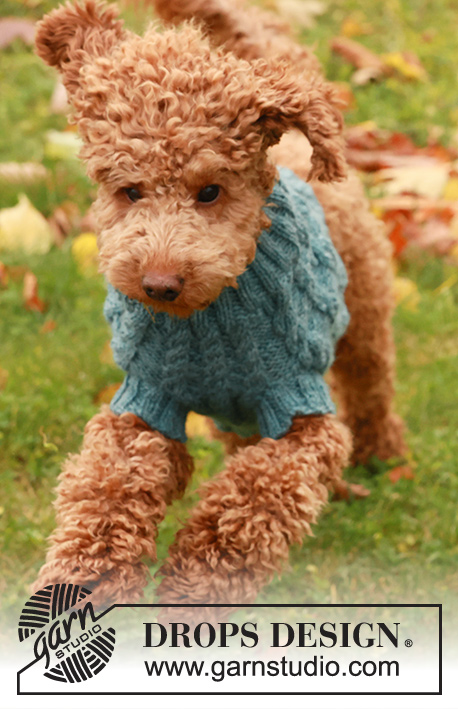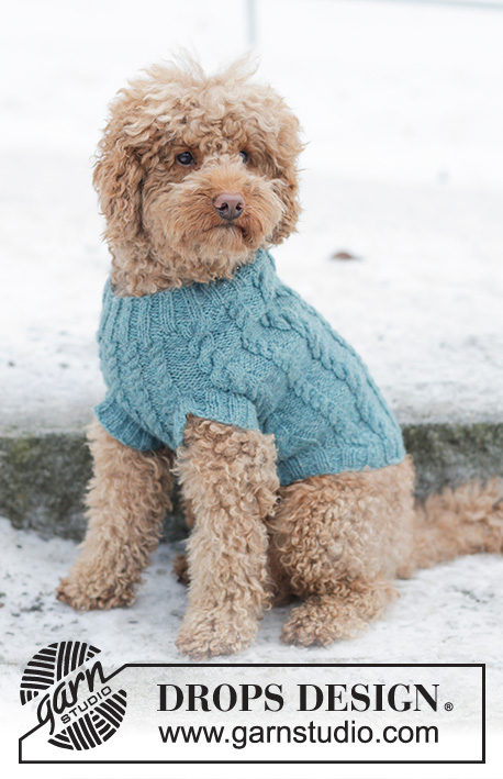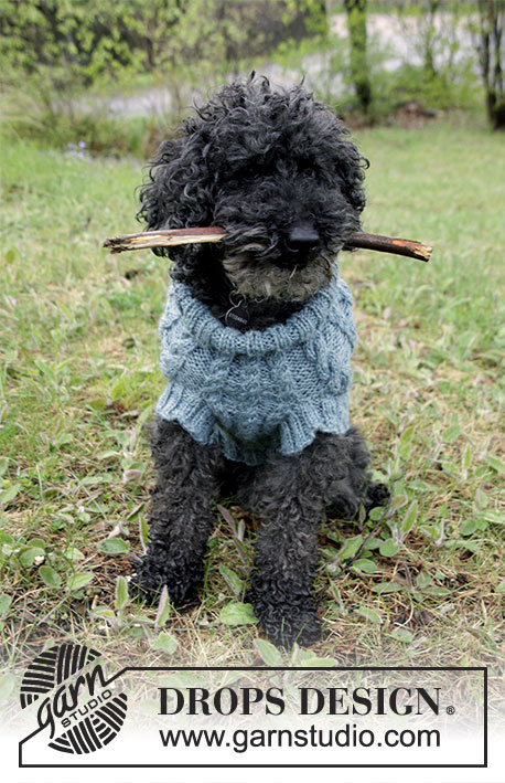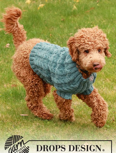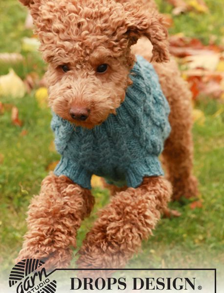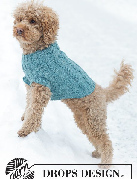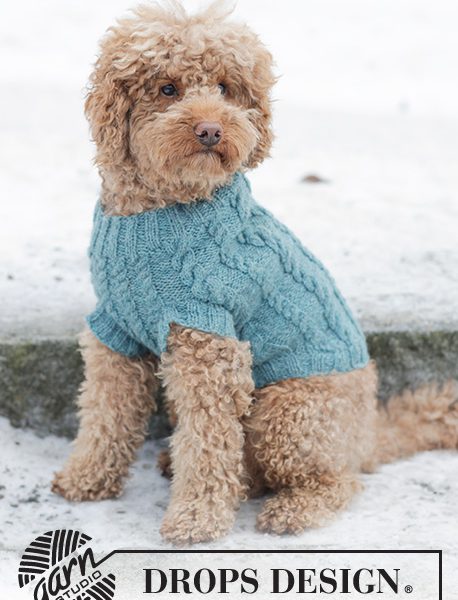 Strikket genser med fletter til hund. Størrelse XS – M. Arbeidet er strikket i DROPS Karisma