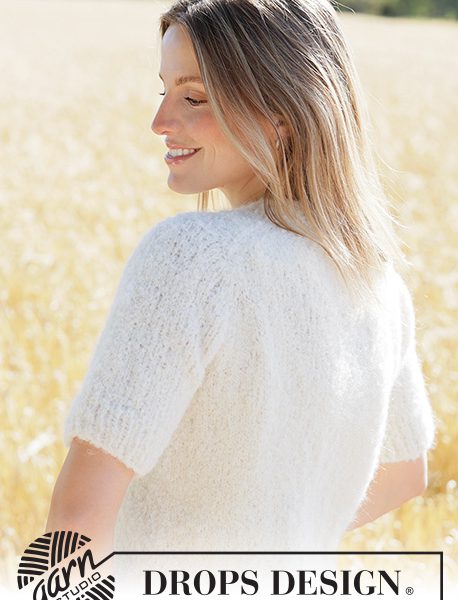 Strikket genser med korte ermer i DROPS Alpaca Bouclé og DROPS Kid-Silk. Arbeidet strikkes ovenfra og ned med europeisk bærestykke og fletter. Størrelse XS – XXXL.