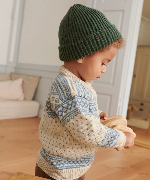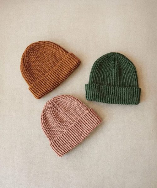 Beanie baby i Double Sunday er en klassisk ribbestrikket lue med brettekant. Den strikkes nedenfra og opp med italiensk opplegg for ekstra elastisitet, og sitter godt på hodet – perfekt for små ører på tur!