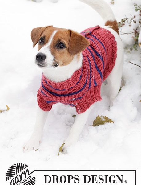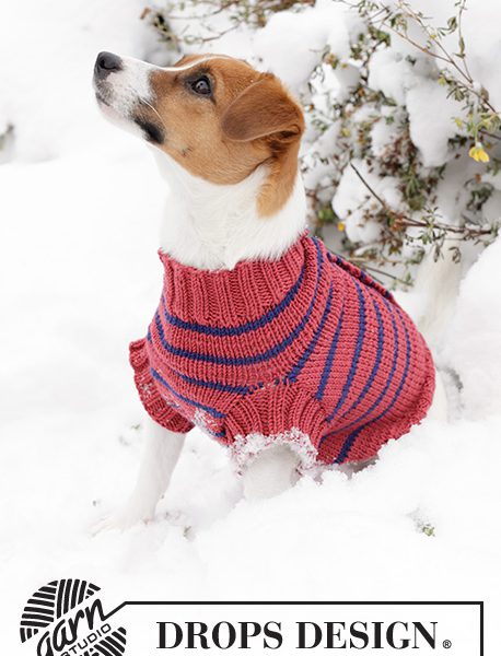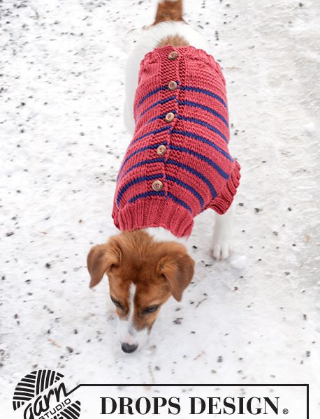 Strikket hundegenser / genser til hund i DROPS Merino Extra Fine. Arbeidet strikkes fra halen mot hals, i glattstrikk med striper og åpning på ryggen. Størrelse: XS – L.