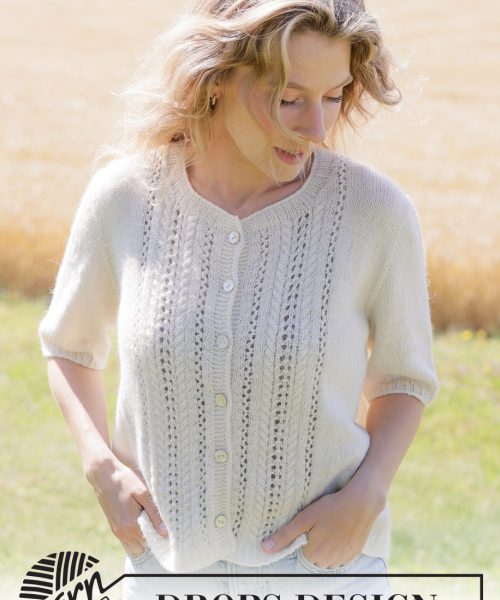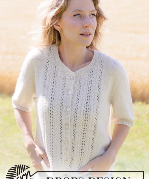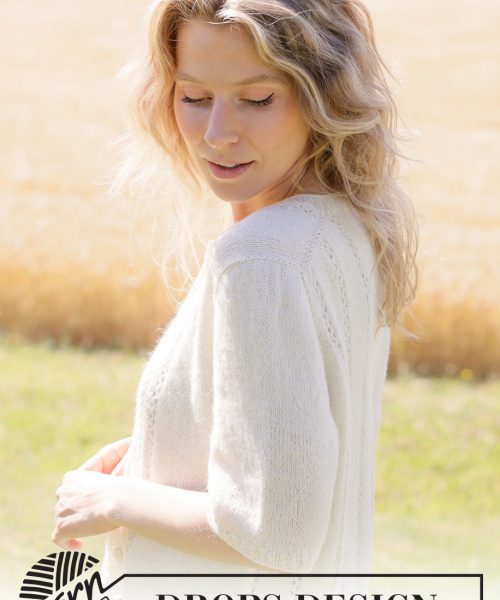 Strikket jakke med korte ermer i DROPS Nord. Arbeidet strikkes ovenfra og ned med europeisk bærestykke, hullmønster og i-cord