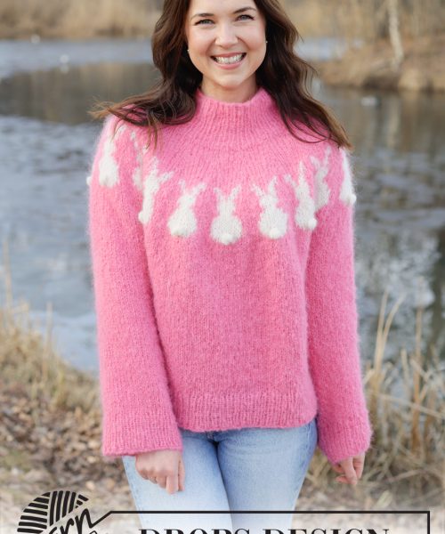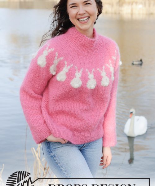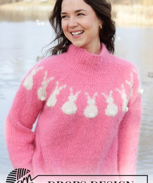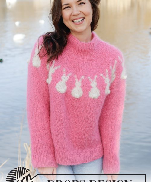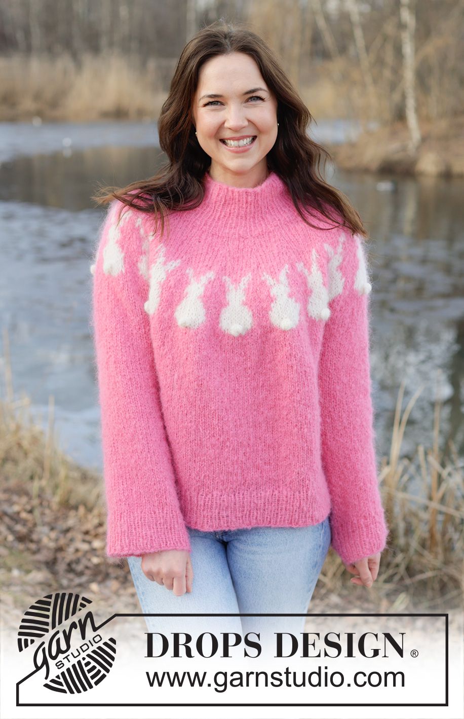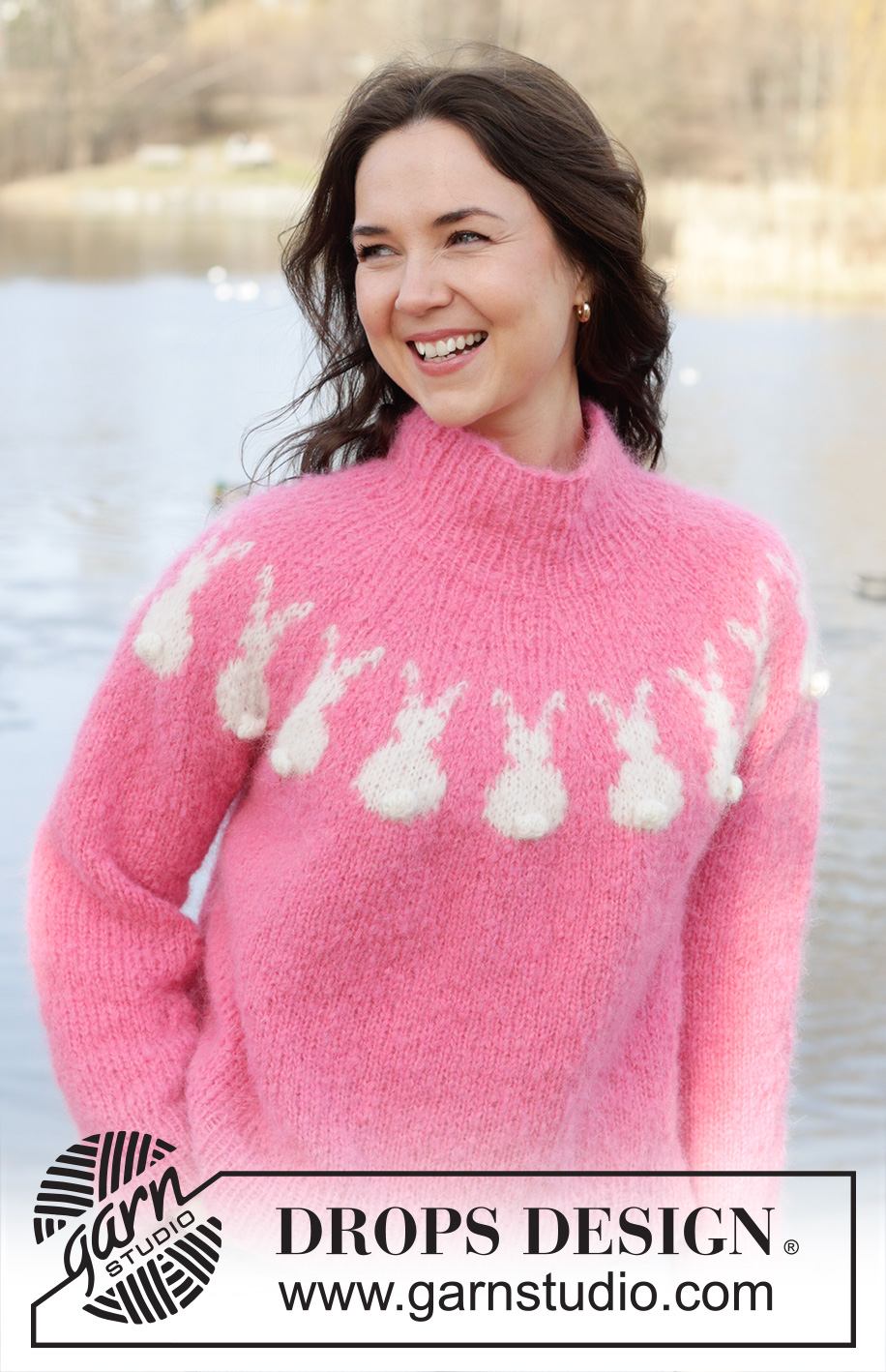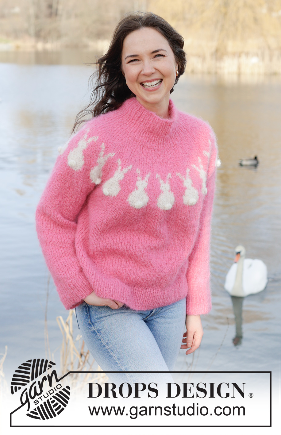 Strikket genser i DROPS Melody. Arbeidet strikkes ovenfra og ned med rundfelling, flerfarget mønster og hare / påskehare. Størrelse XS – XXL. Tema: Påske.