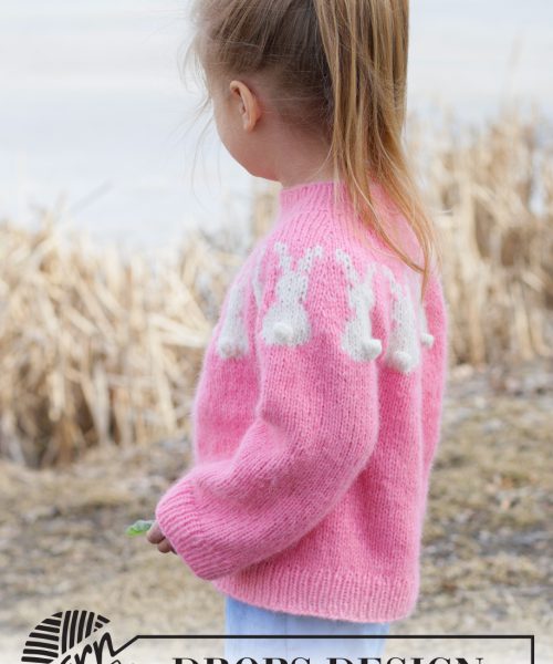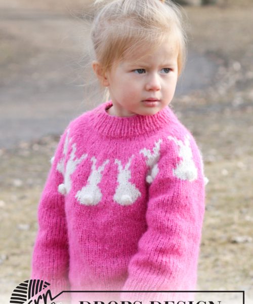 Strikket genser til barn i DROPS Air. Arbeidet strikkes ovenfra og ned med rundfelling, flerfarget mønster og hare / påskehare. Størrelse 2 – 14 år. Tema: Påske.