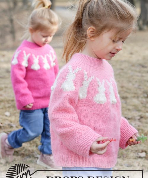 Strikket genser til barn i DROPS Air. Arbeidet strikkes ovenfra og ned med rundfelling, flerfarget mønster og hare / påskehare. Størrelse 2 – 14 år. Tema: Påske.