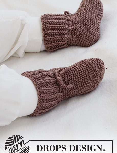 Strikkede tøfler til baby og barn DROPS BabyMerino. Arbeidet strikkes i hel patent og riller. Størrelse 1 mnd – 4 år.