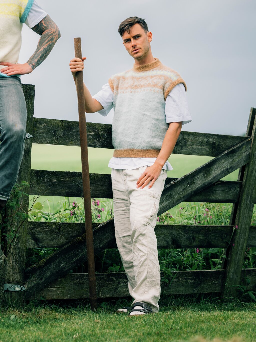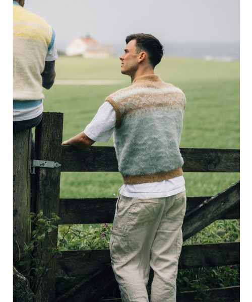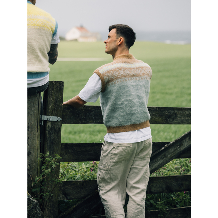 CORTINA herre vest i dus grågrønn Faerytale og Alpakka Forte. Vest med mønster og rund hals.
