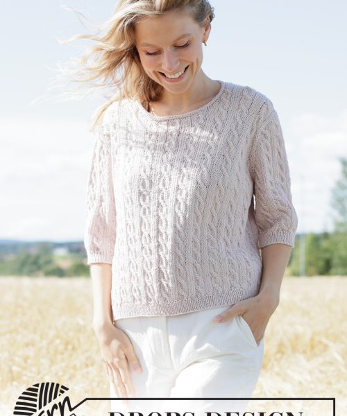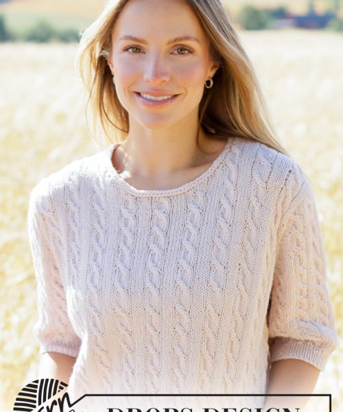 Strikket genser med korte ermer i DROPS Cotton Merino eller DROPS Belle. Arbeidet strikkes ovenfra og ned med europeisk bærestykke, fletter og i-cord. Størrelse XS – XXXL.