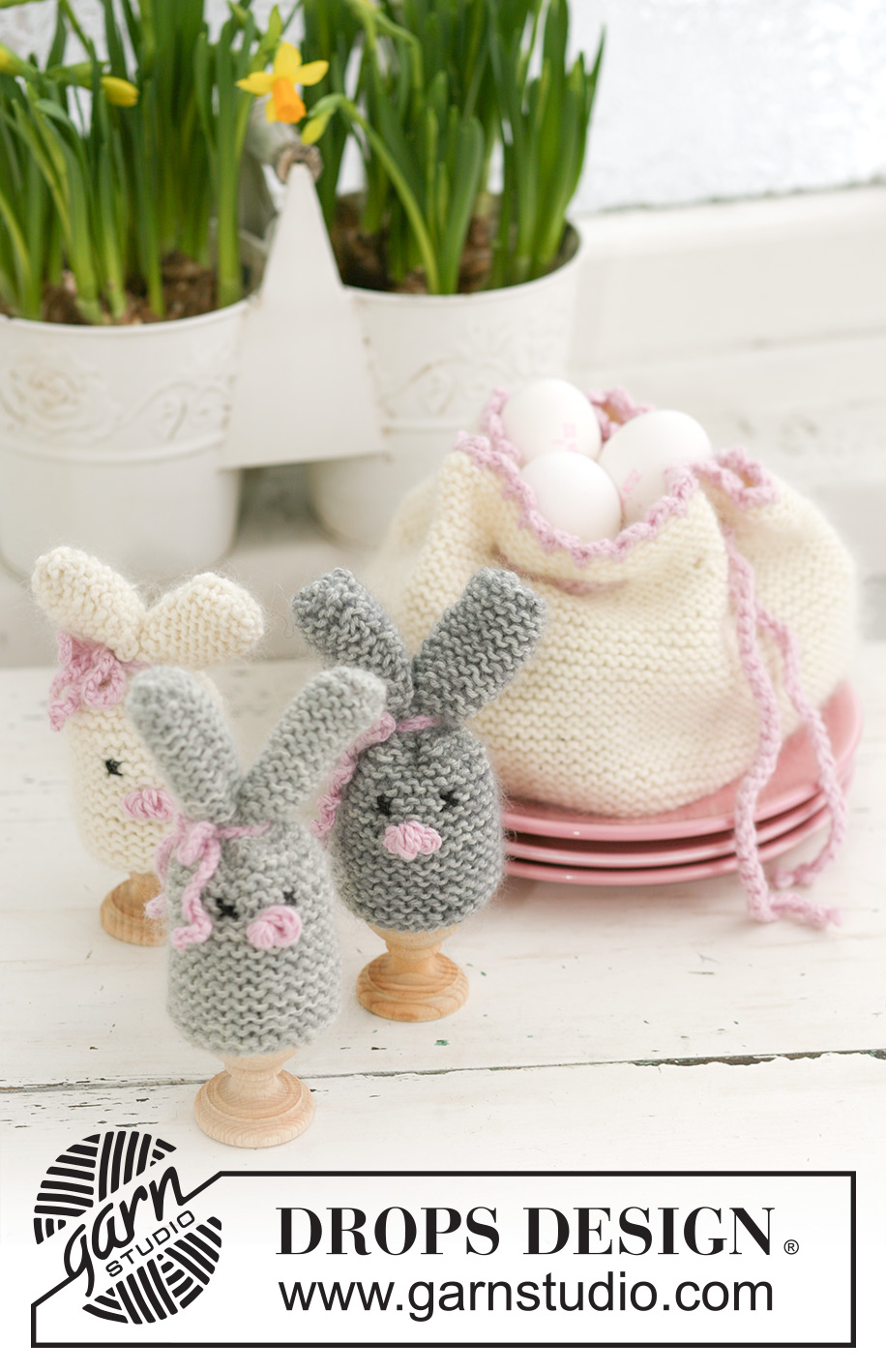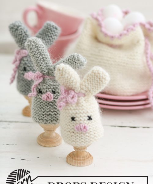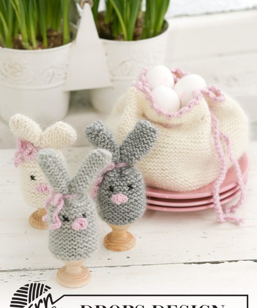 Settet består av: DROPS påskehare eggvarmer og eggepose i ”Merino Extra Fine” og ”Kid-Silk”