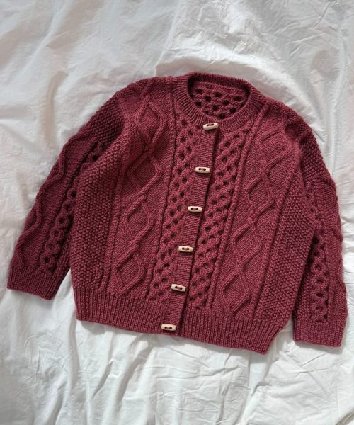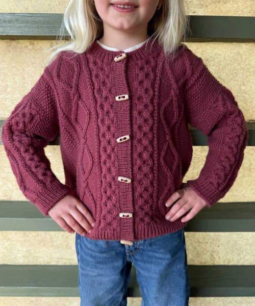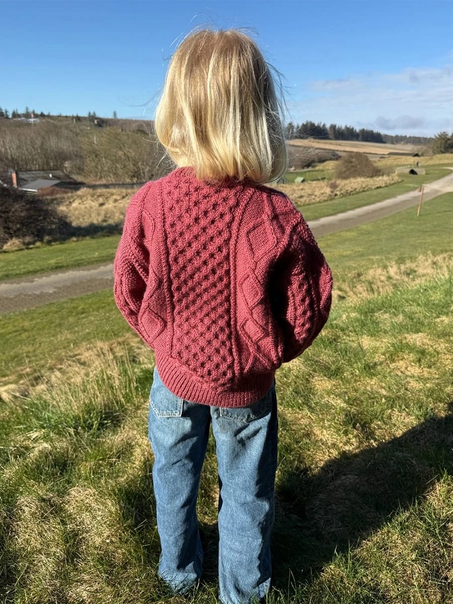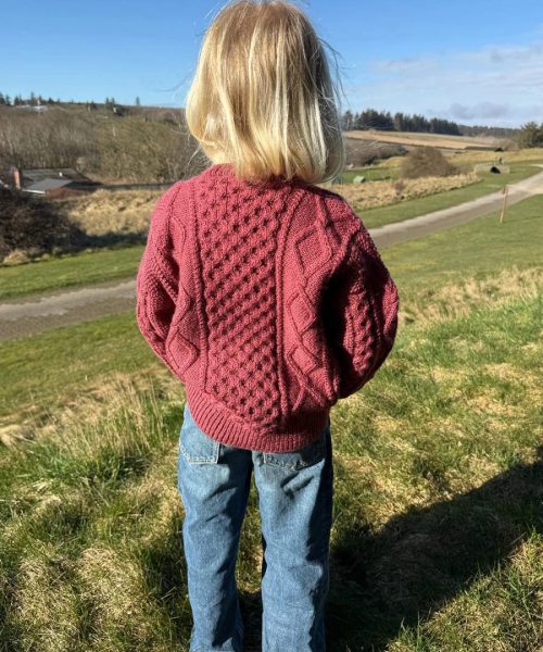Dagmar Jacket Junior strikkes ovenfra og ned i strukturstrikk. Strikkes i Peer Gynt eller Double Sunday
