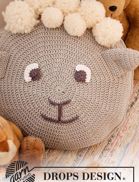 Heklet rundt putetrekk i DROPS Paris og DROPS Snow. Arbeidet hekles rundt i sirkel og dekoreres som en sau.