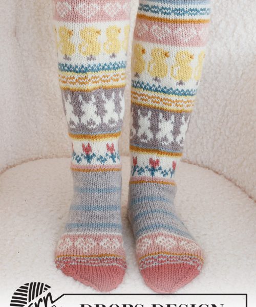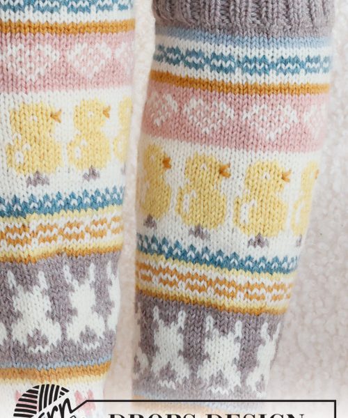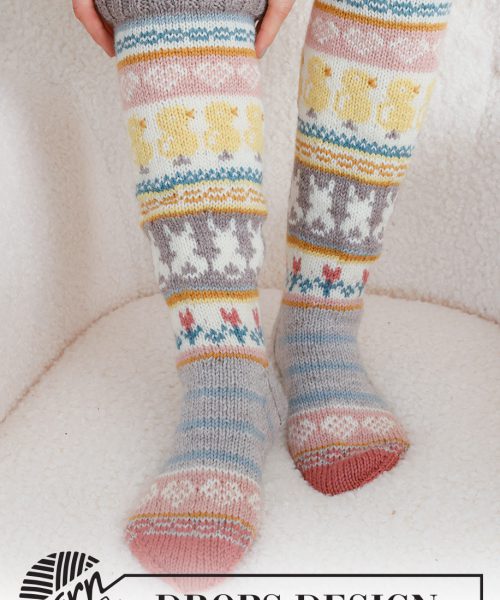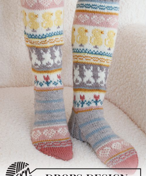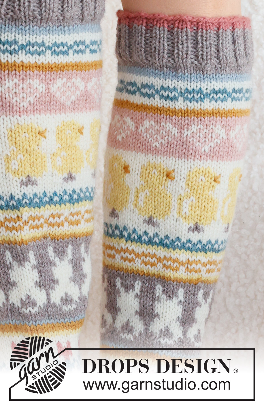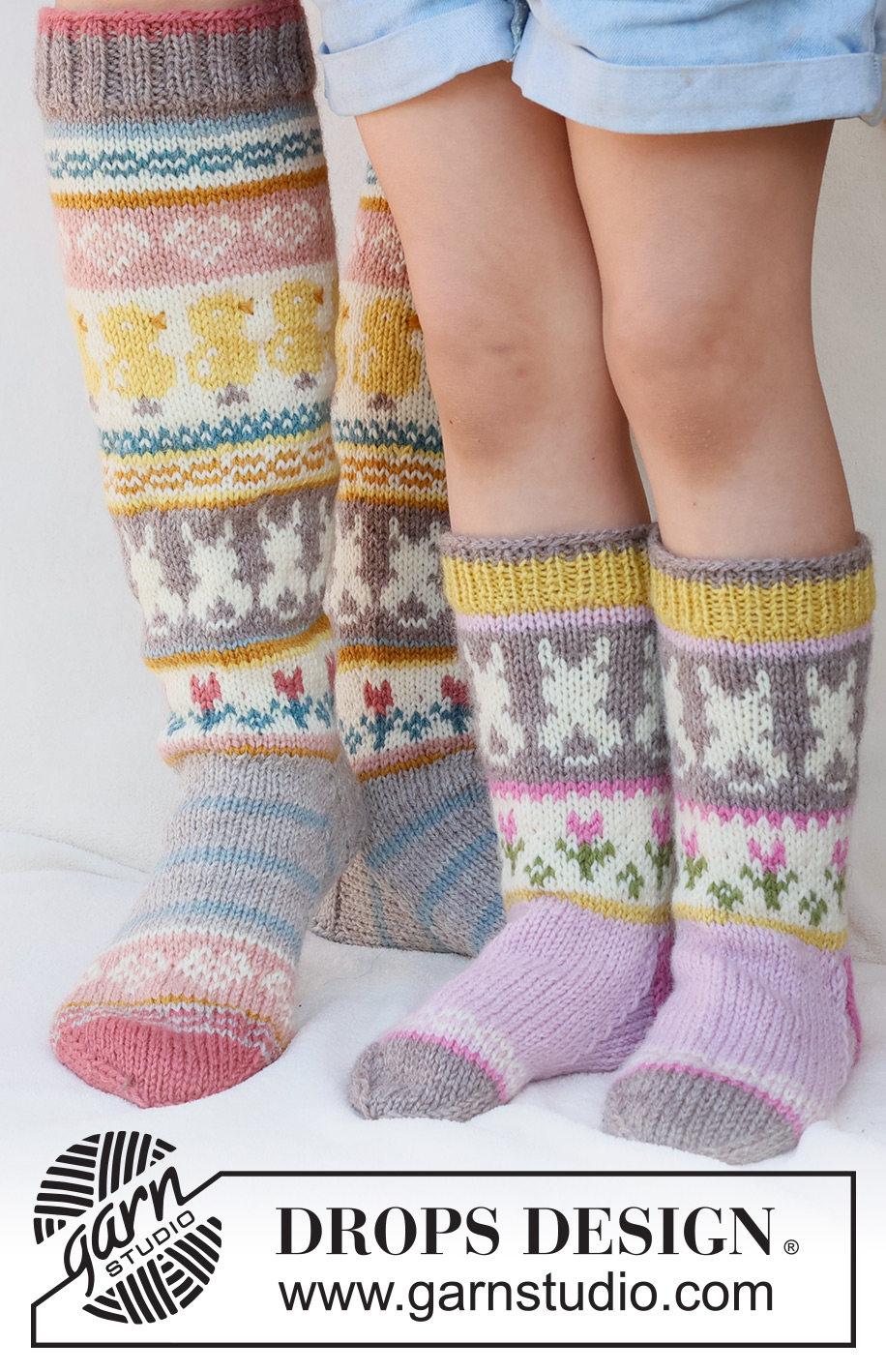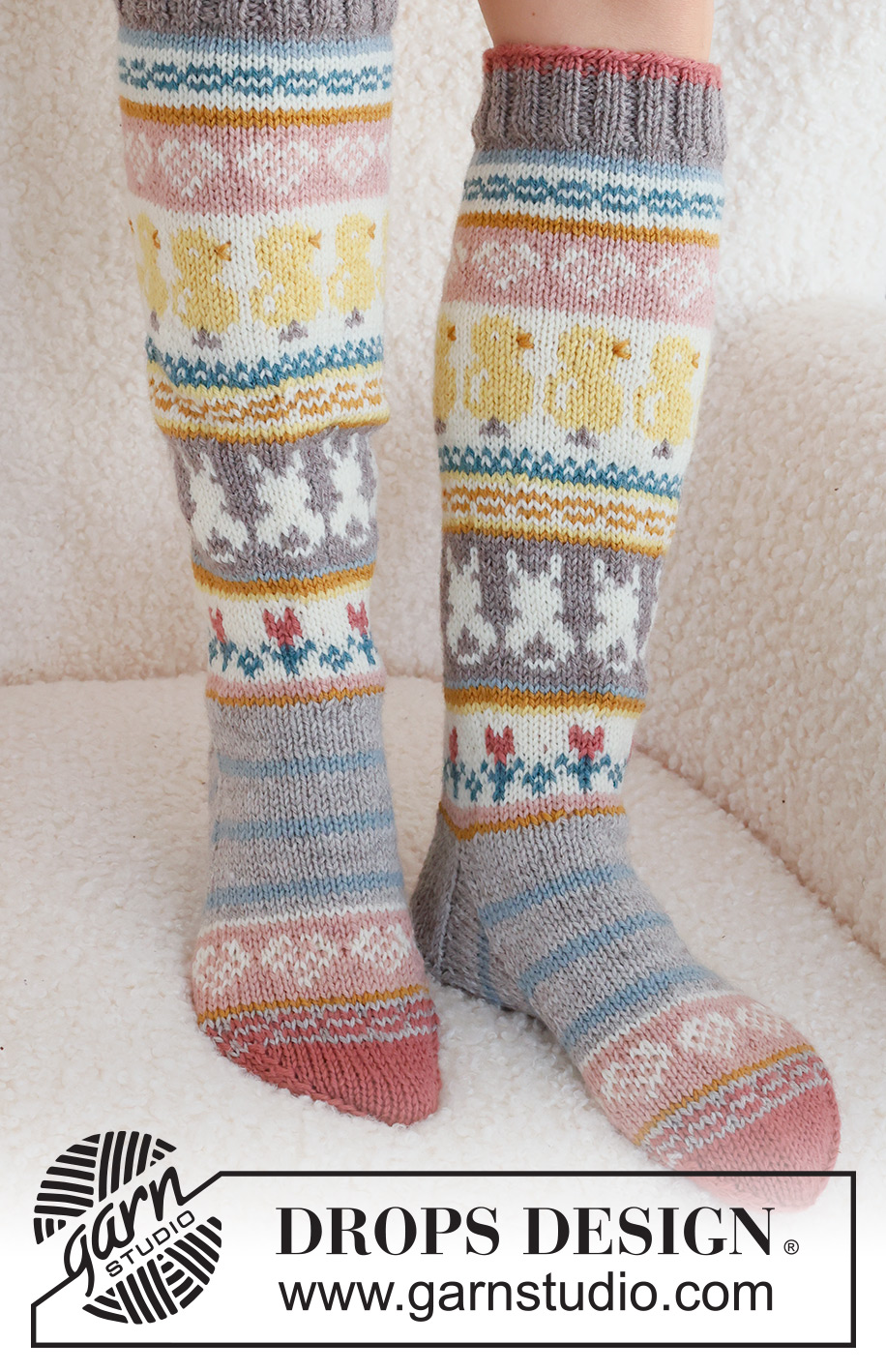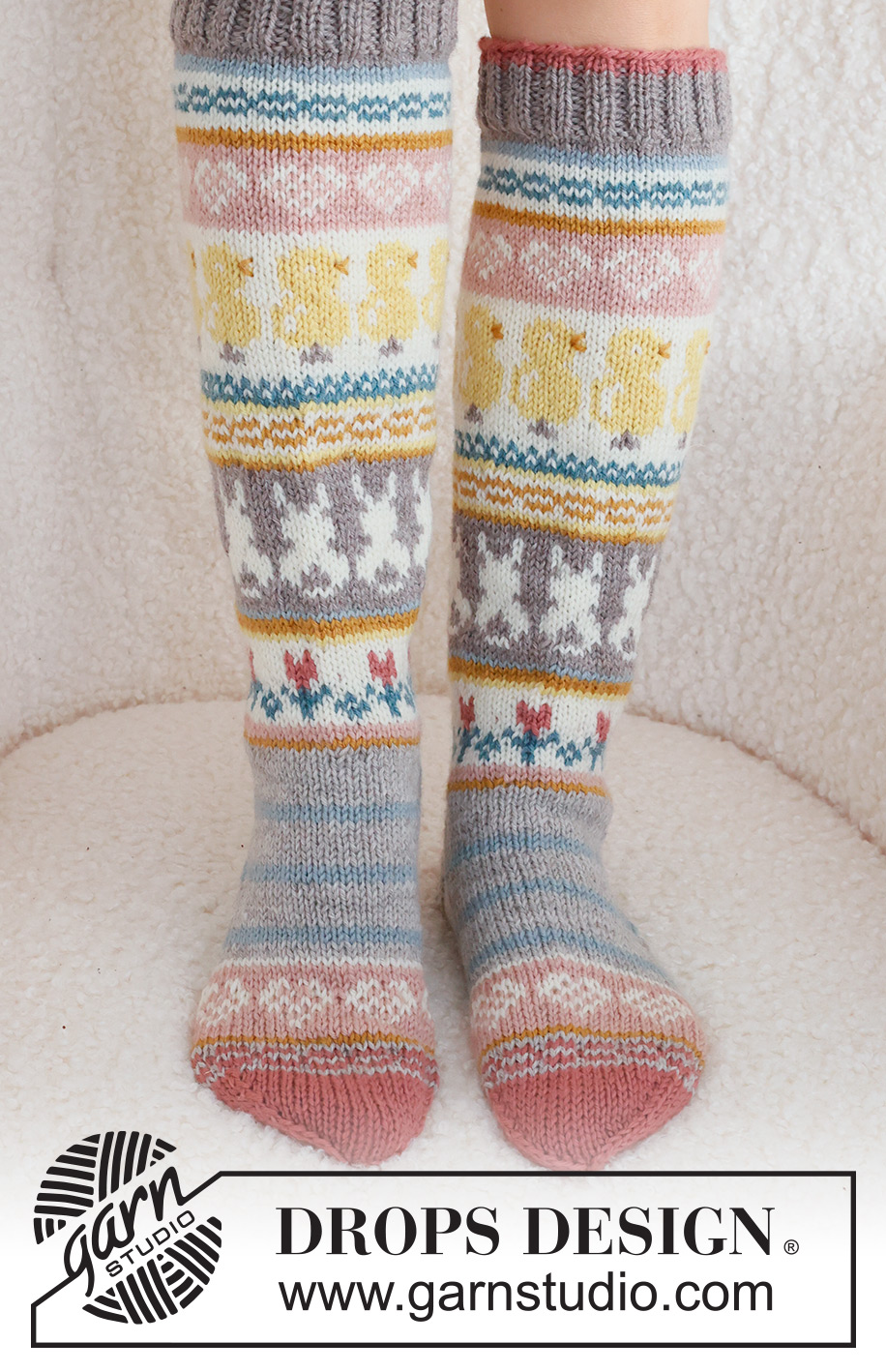 Strikkede sokker i DROPS Karisma. Arbeidet strikkes ovenfra og ned, i glattstrikk med flerfarget mønster med hjerte, kylling / påskekylling, hare / påskehare og blomst.