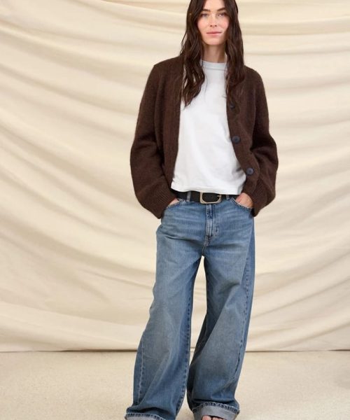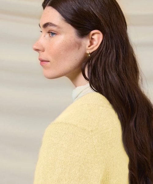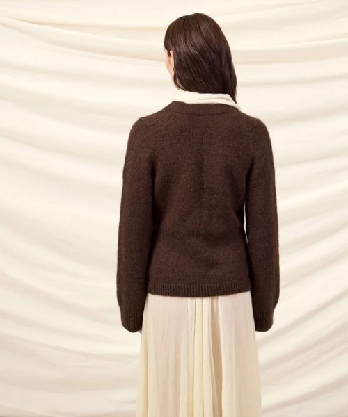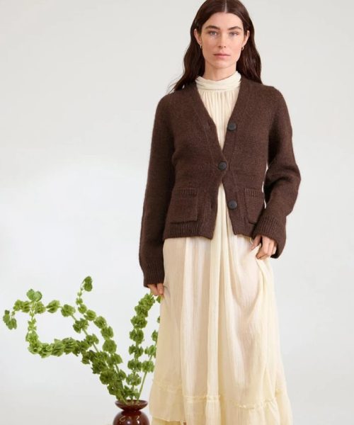 Cardigan strikket ovenfra og ned med én tråd Alpakka Ull og én tråd Tynn Silk Mohair. V-hals, formet liv, glattstrikkede ermer og dobbelstrikket forkant med påsydde lommer.