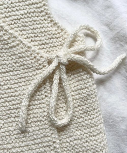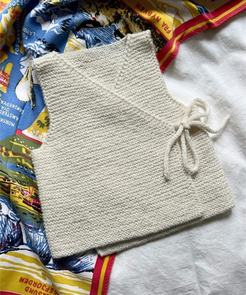 Fagerborg omslagsvest strikkes ovenfra og ned, frem og tilbake i rillestrikk på en lang rundpinne. Vesten lukkes med i-cord knytesnorer i Sunday.