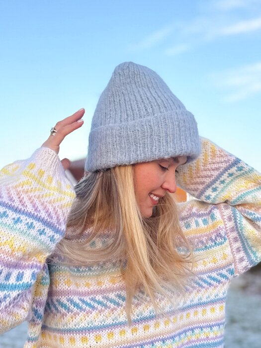 Strikkepakke FROST lue i sky blue Fnugg in Florence fra Ingrid Raadim og House of Yarn.