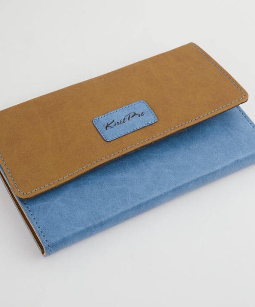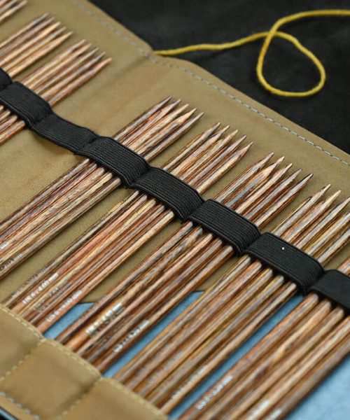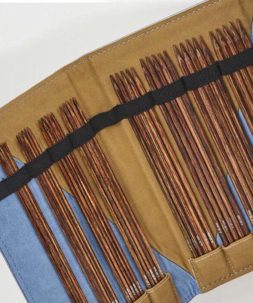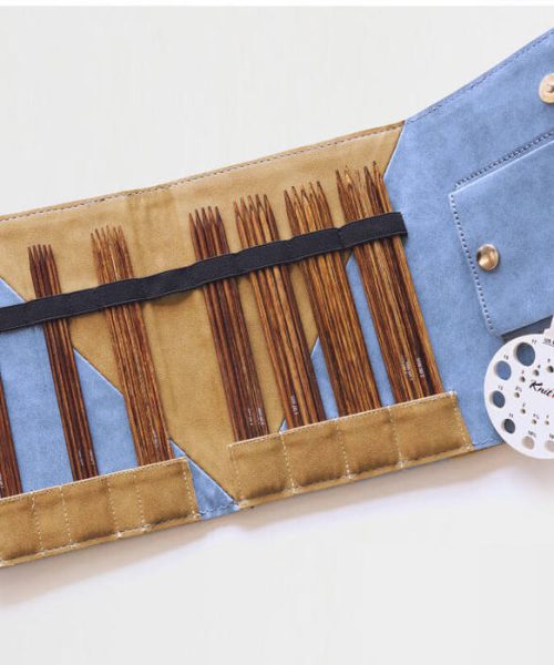 Ginger 20 cm strømpepinnesett i 2,5 til 6 mm tykkelse. Oppbevaringsmappen er i en lekker jeansblå og brun farge, som gir et ungdommelig preg på pinnesettet.