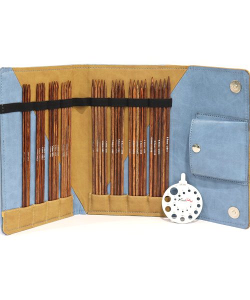 Ginger 20 cm strømpepinnesett i 2,5 til 6 mm tykkelse. Oppbevaringsmappen er i en lekker jeansblå og brun farge, som gir et ungdommelig preg på pinnesettet.