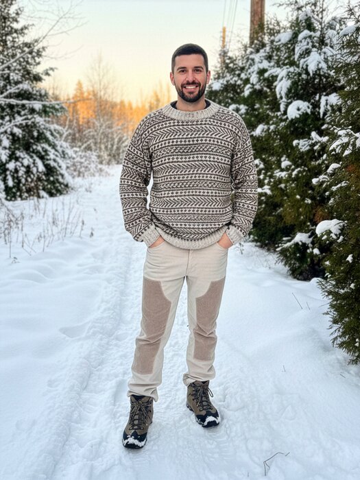 | Teknikk | Isydde ermer, Mønster, Rund hals, Vrangbord |