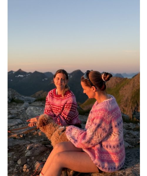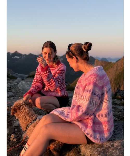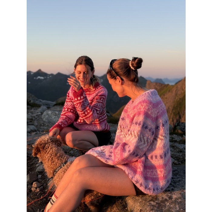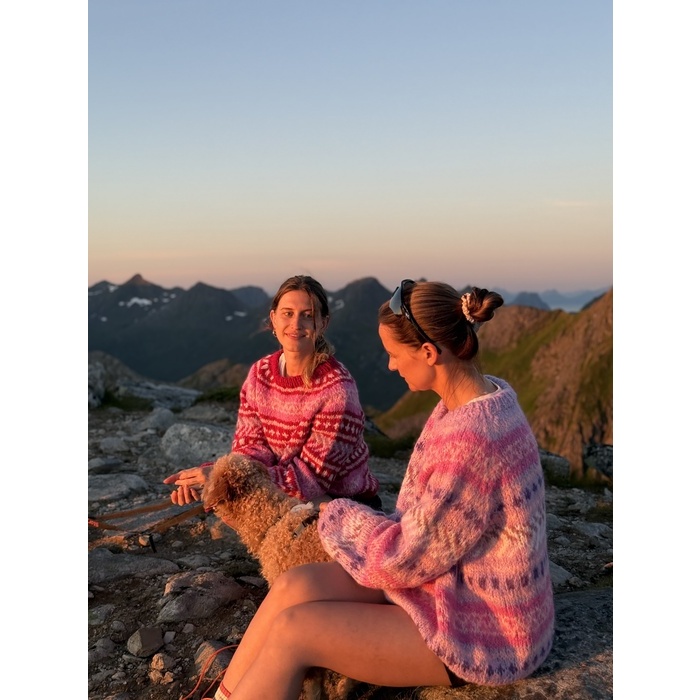 Genseren har et fint fargemønster og avsluttes med en ribbestrikket halskant.