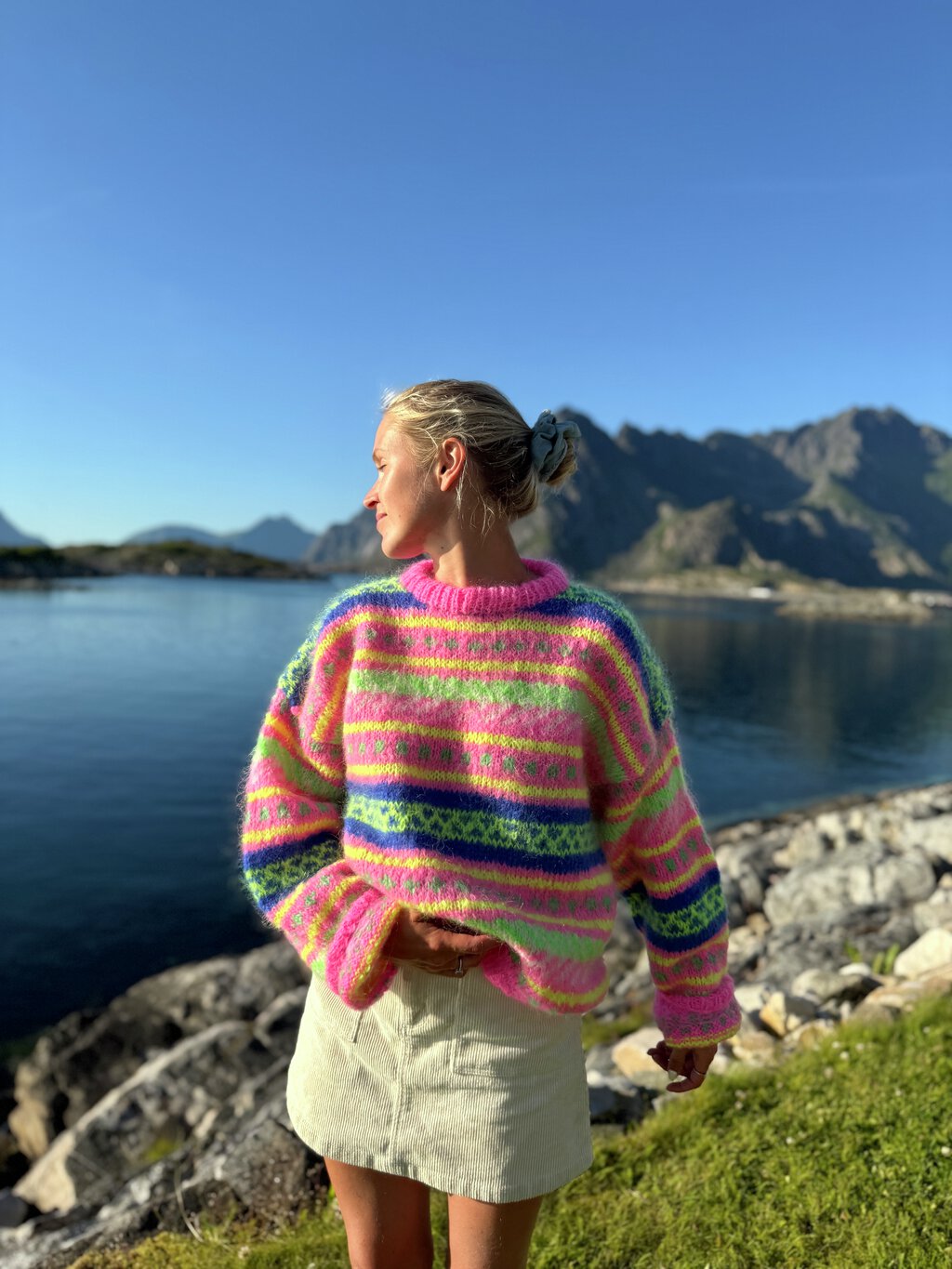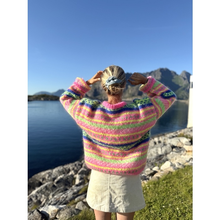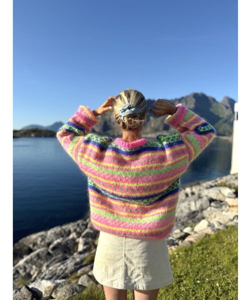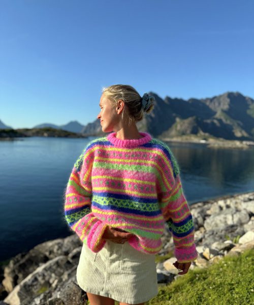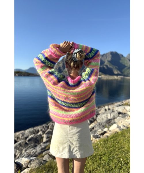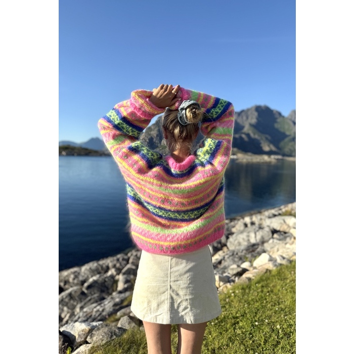 Strikkepakke HANAMI genser, neonrosa, neongul, hvit, blå og neongrønn.