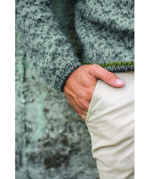 HERREGENSER i grå med grønt mønster. Genseren har isydde ermer og rund hals. En flott herregenser som varmer godt på den kalde årstiden. Garnet som følger med i strikkepakken er Alpakka Tweed, et merino -alpakka-donegal blandingsgarn.