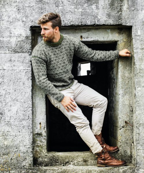 HERREGENSER i grå med grønt mønster. Genseren har isydde ermer og rund hals. En flott herregenser som varmer godt på den kalde årstiden. Garnet som følger med i strikkepakken er Alpakka Tweed, et merino -alpakka-donegal blandingsgarn.