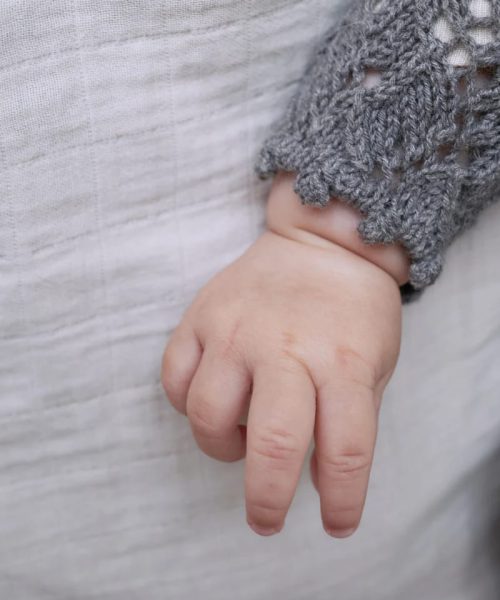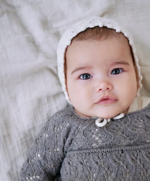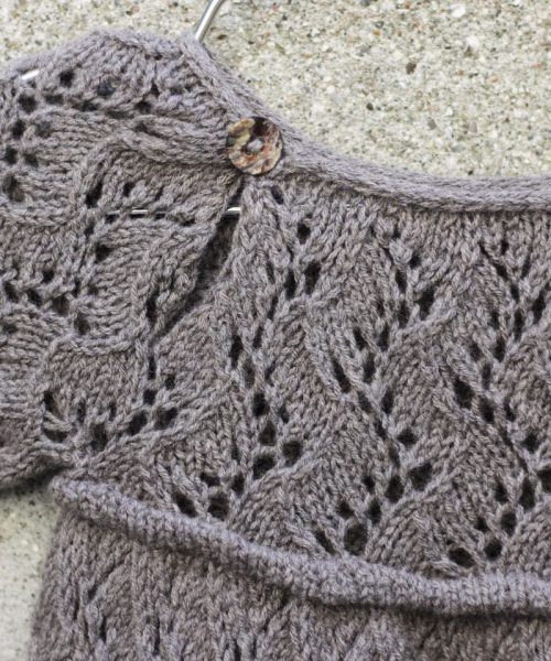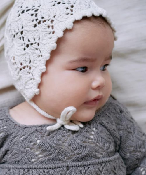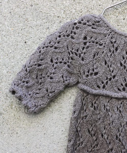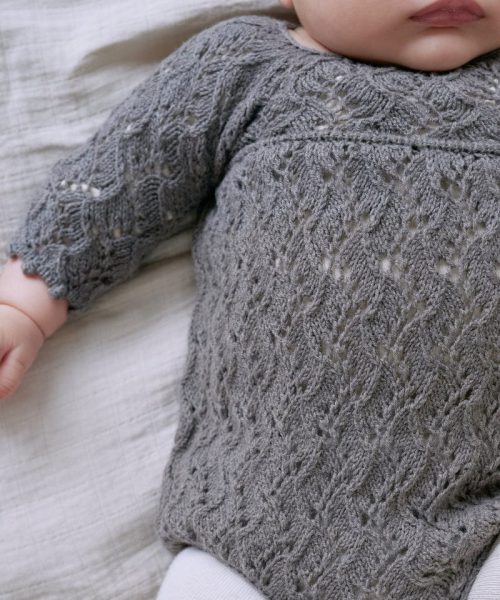 Holly Romper har et heldekkende, kartlagt blondemønster med en dekorativ kant langs overkroppen. I-cord-kantene rundt benåpningene trekker stoffet inn og gir den nedre delen av romperen en puffet eller nesten ballongaktig form. Sparkedrakten strikkes med 1 tråd av enten Merino eller Pure Silk.