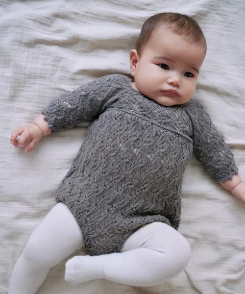 Holly Romper har et heldekkende, kartlagt blondemønster med en dekorativ kant langs overkroppen. I-cord-kantene rundt benåpningene trekker stoffet inn og gir den nedre delen av romperen en puffet eller nesten ballongaktig form. Sparkedrakten strikkes med 1 tråd av enten Merino eller Pure Silk.