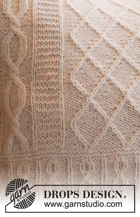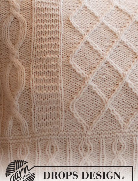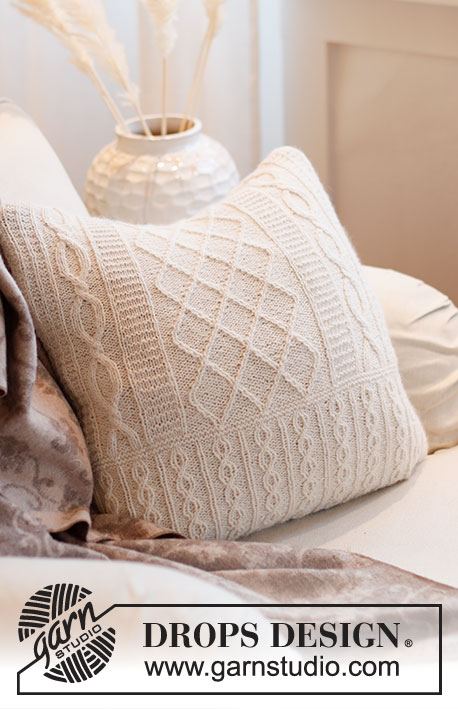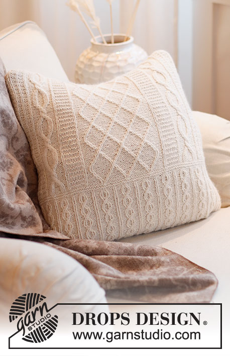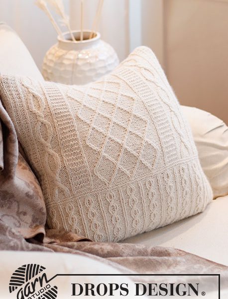 Strikket pute med fletter i DROPS Puna. Arbeidet strikkes rundt.