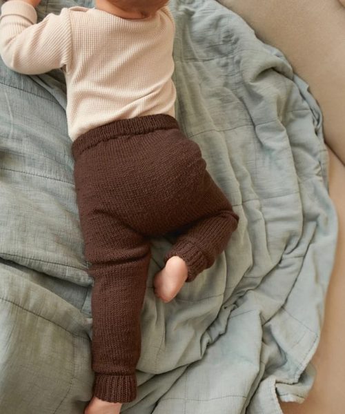Lille bukse baby i Babyull Lanett er en myk og behagelig bukse med lang brukstid. Den strikkes ovenfra og ned med dobbel vrangbord i livet, vendepinner bak og ekstra lange benkanter som kan brettes opp etter behov.