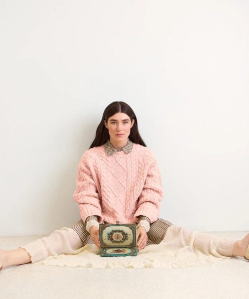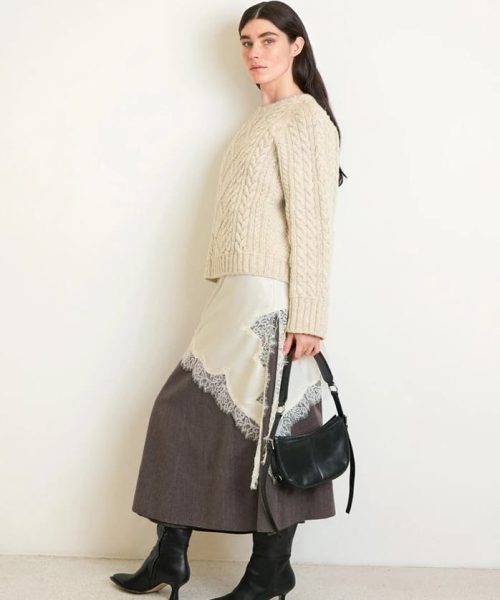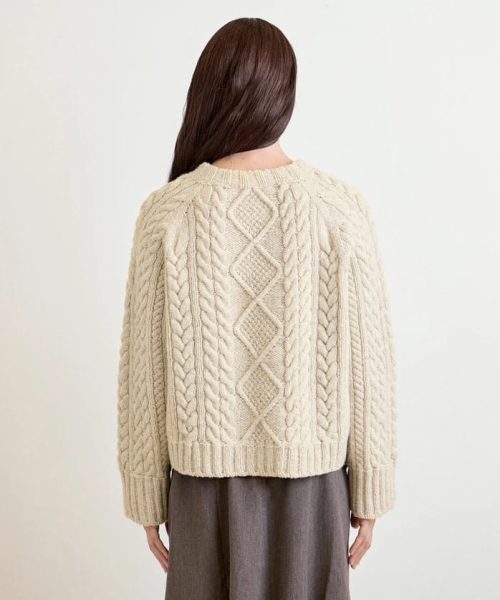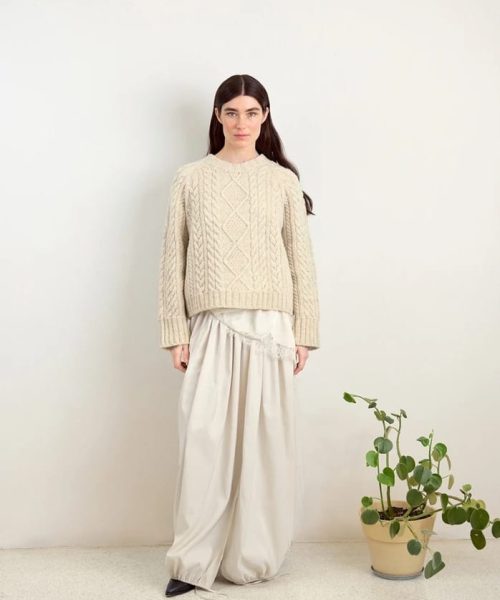 Genser strikket ovenfra og ned med raglanøkninger og flettemønster i ATLAS. Formet hals med vendepinner og dobbelbrettet halskant.