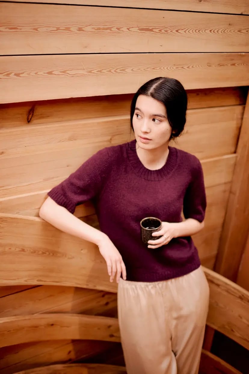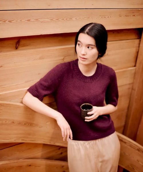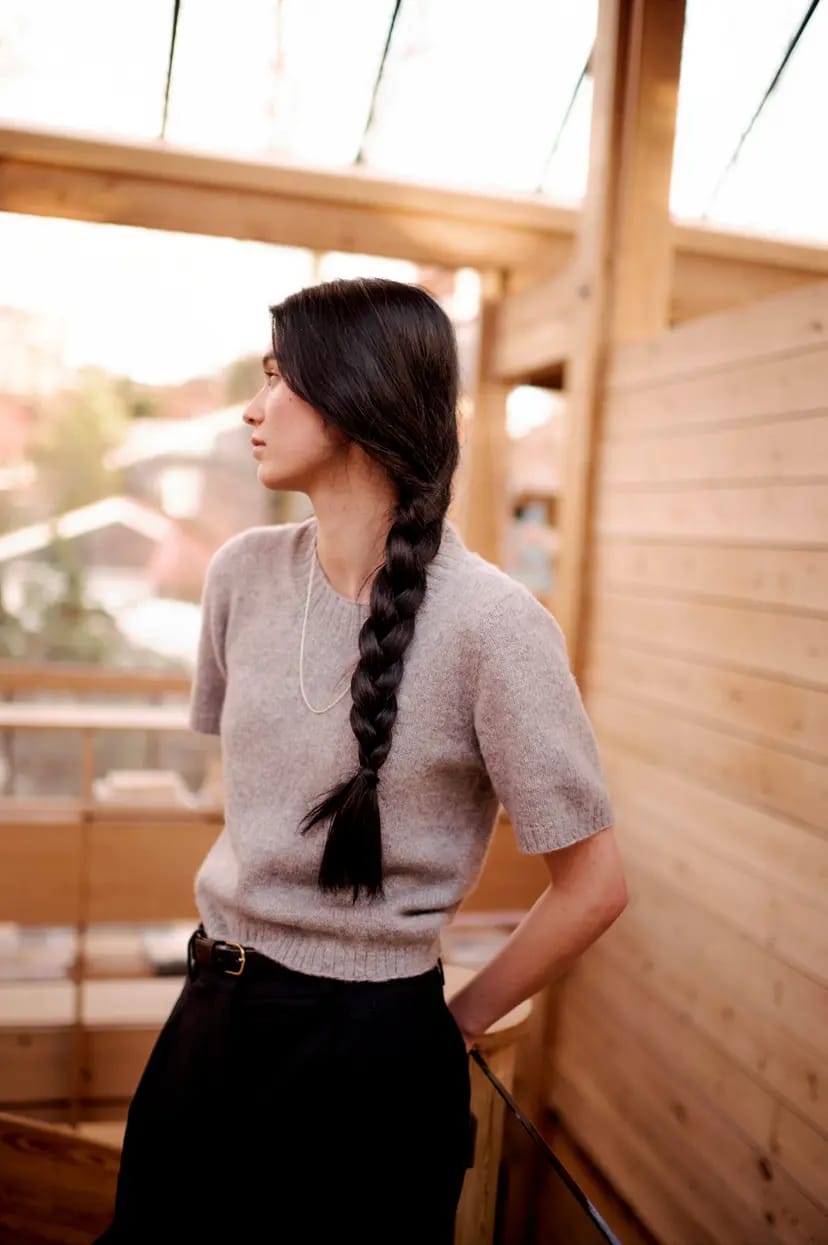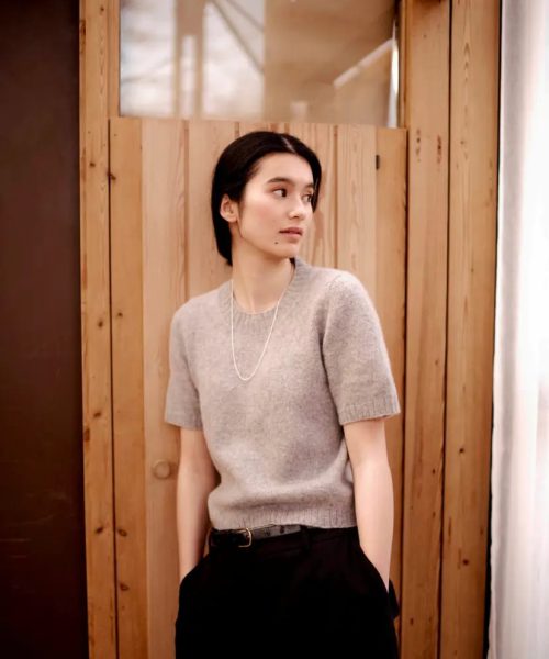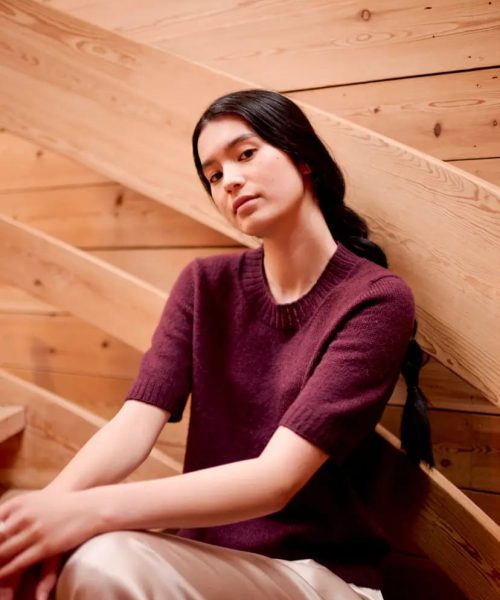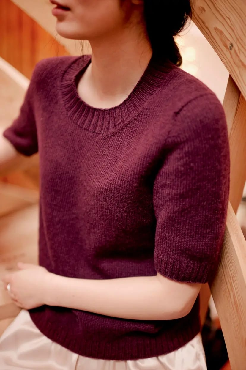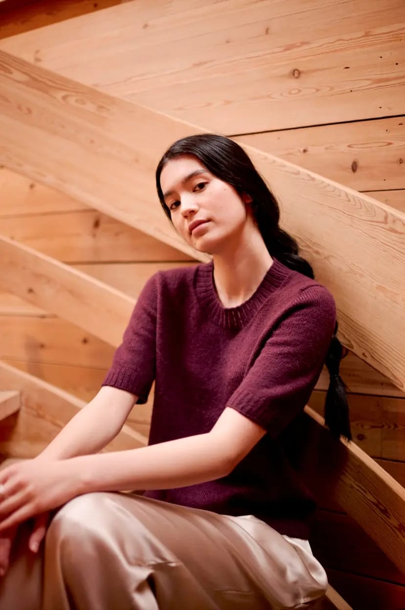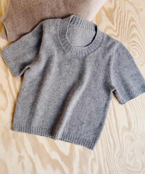 Lun Lauratee er en delikat, glattstrikket t‑skjorte med et klassisk uttrykk. Silhuetten er enkel og rett med skrå skuldre, rund hals og korte ermer. Den strikkes ovenfra og ned med en sammensatt konstruksjon som gir en behagelig og pen passform.
