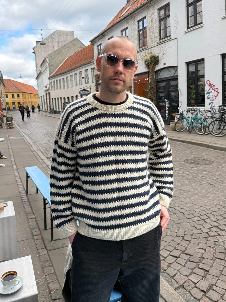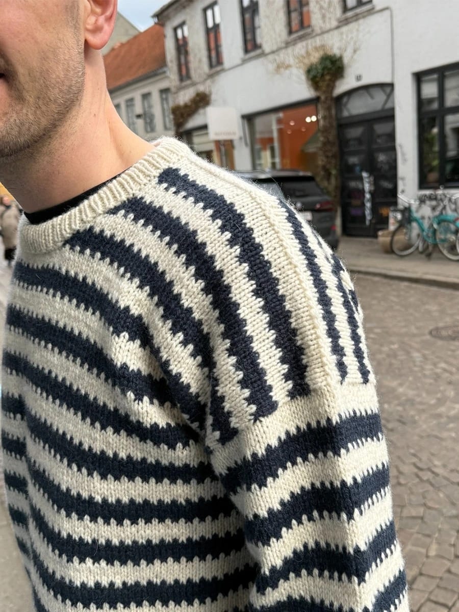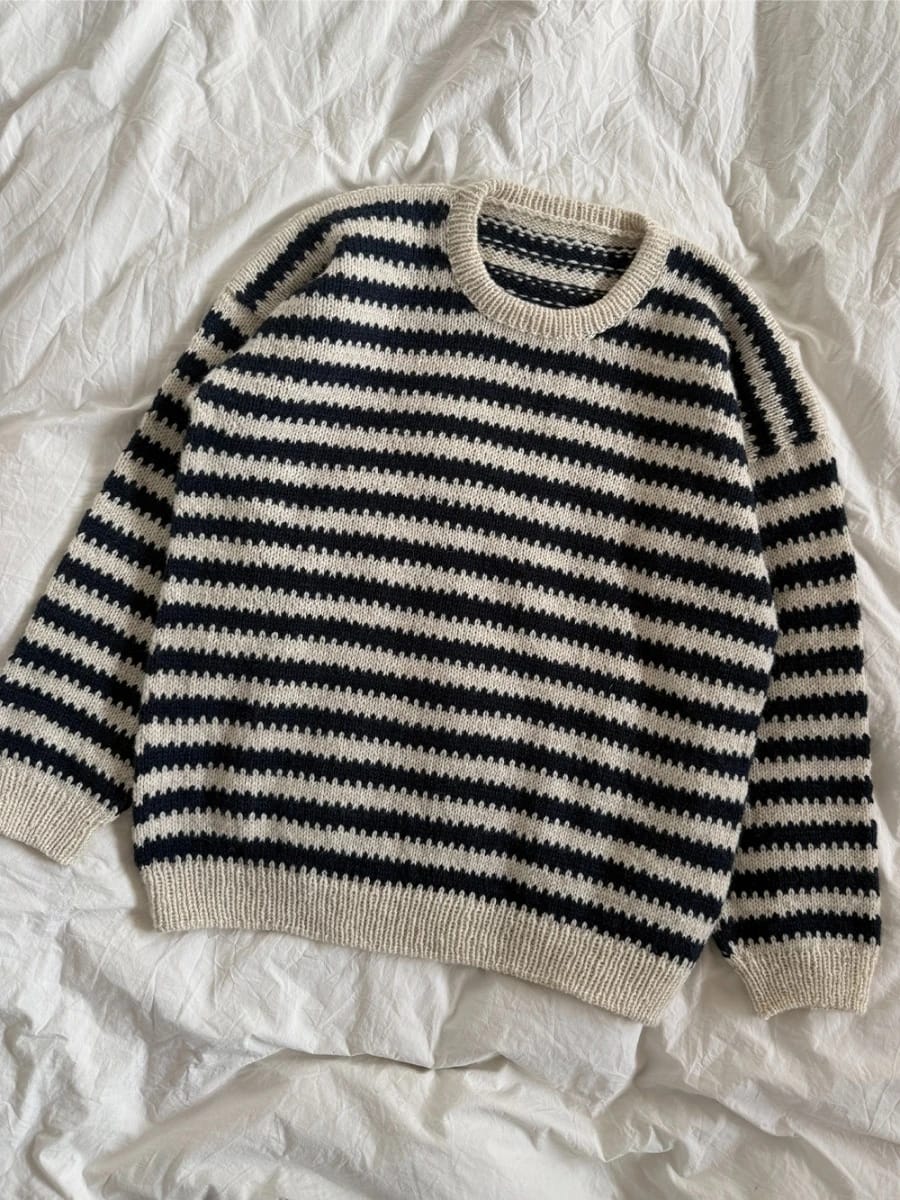 Otto Sweater Man strikkes ovenfra og ned i et stripemønster. Først strikkes bakstykket. deretter strikkes skuldrene hver for seg frem og tilbake på rundpinne. Disse samles foran for å danne forstykke. Videre samles forstykke og bakstykke for å danne bolen som strikkes rundt på rundpinne. Ermene strikkes ut fra opplukkede masker langs ermeåpningen. Halsens brettede halskant strikkes til slutt ut fra opplukkede masker. Strikket i Atlas.