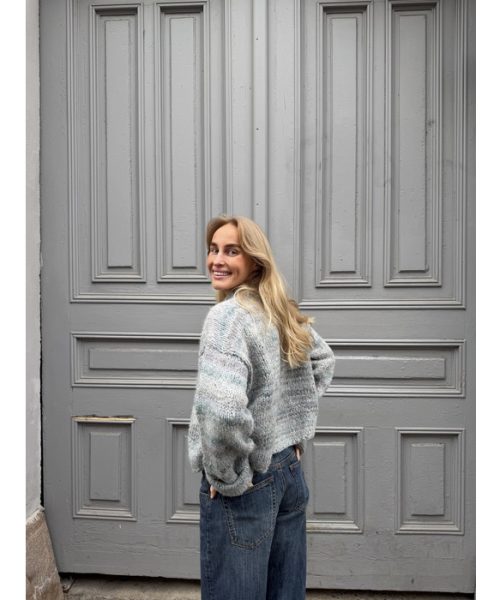 ØYUNN jakke 2.0 i aquafarget print Pretty Print Ullgarn og Faerytale. Glattstrikket jakke med isydde ermer.