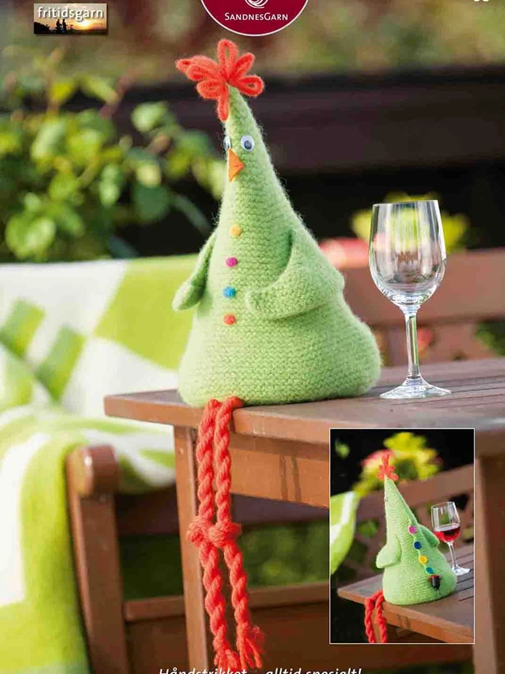 Høne til vinpose, strikkes i Fritidsgarn og toves