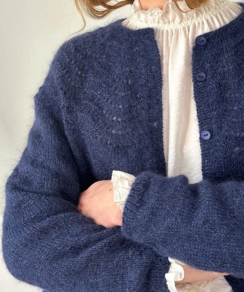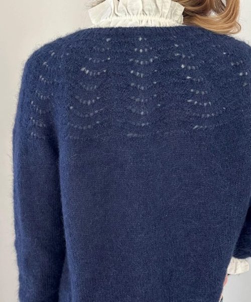 Peacock Cardigan fine er strikket ovenfra og ned, og halsutringningen er formet med vendepinner under mønsteret.