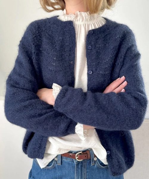 Peacock Cardigan fine er strikket ovenfra og ned, og halsutringningen er formet med vendepinner under mønsteret.