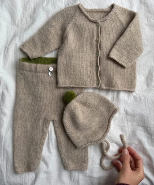Cardiganen strikkes ovenfra og ned med raglanøkninger. LUE Strikkes fra toppen og ned. BUKSER