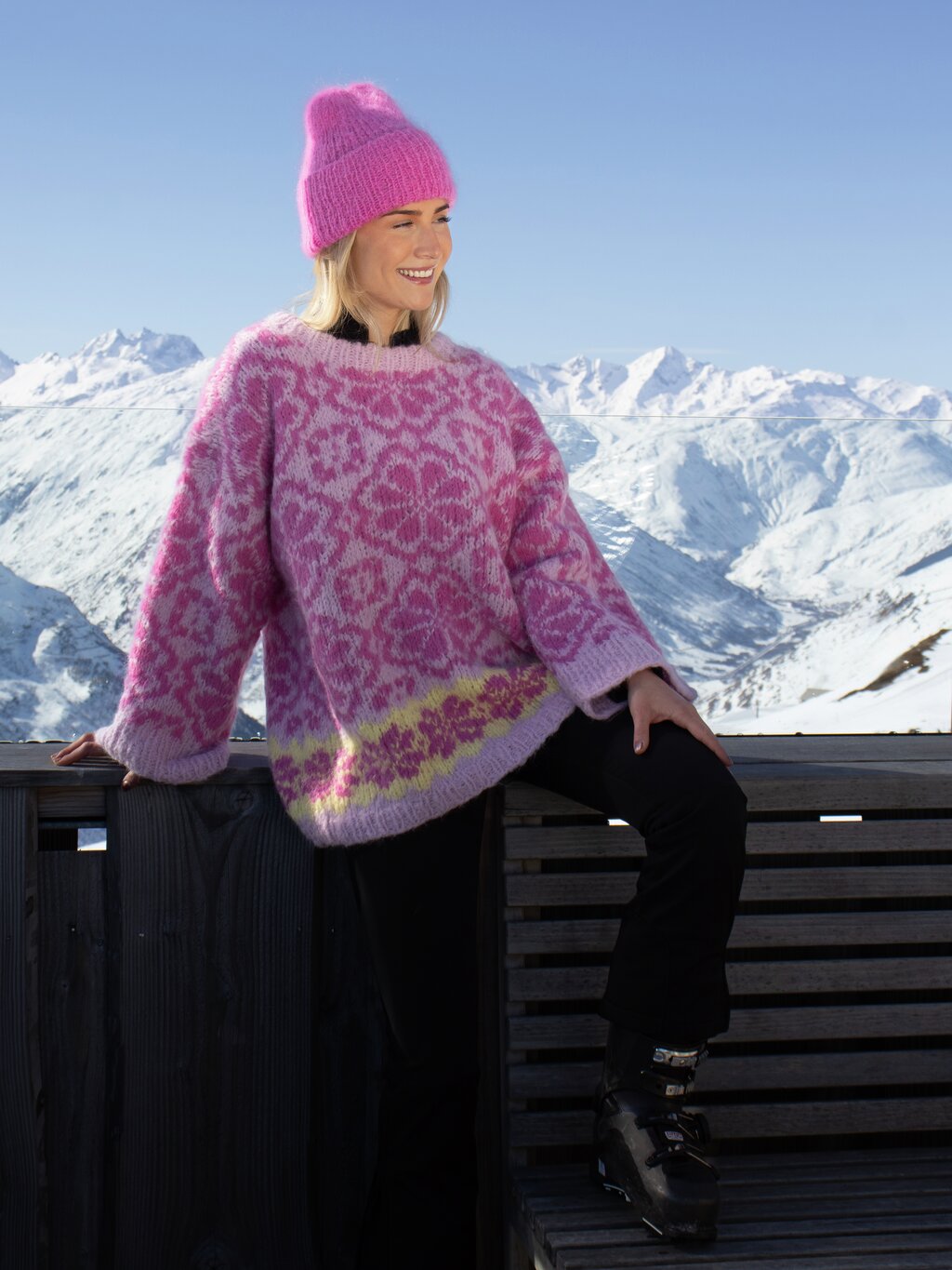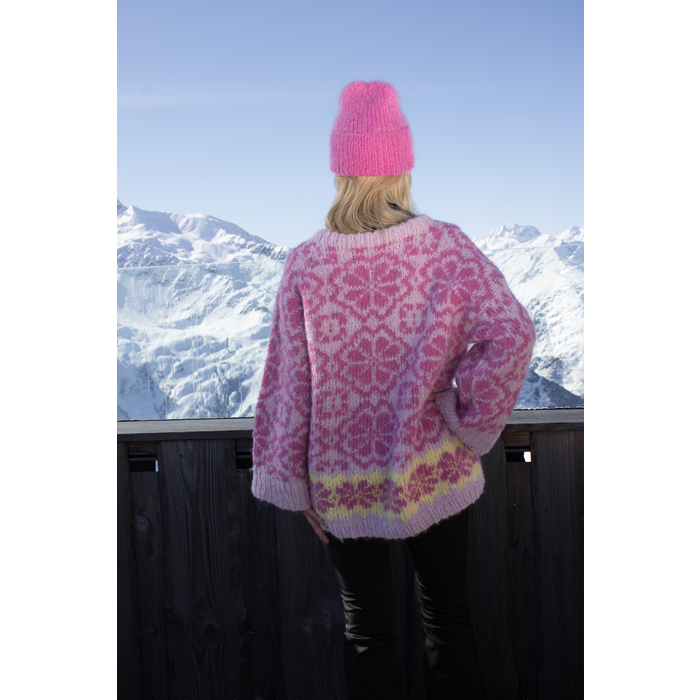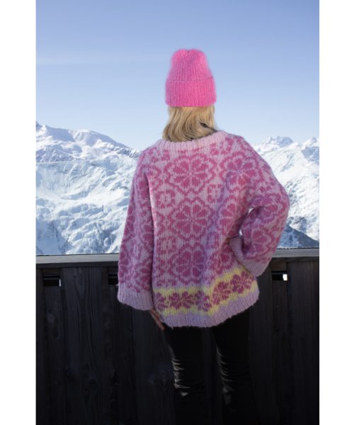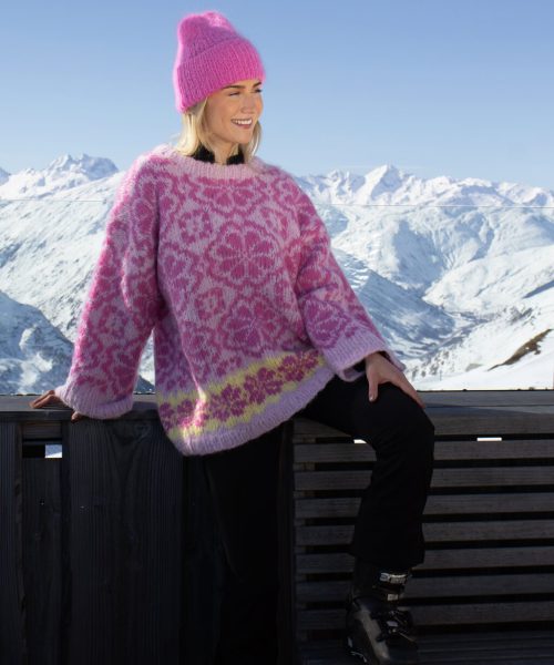 Q-SYMRE genser i pearl pink Fnugg in Florence. Mønstret genser med isydde ermer.