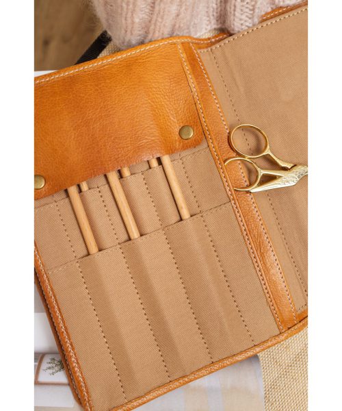 PROJECT 67 er et hefteformet nåleetui. Med flere sider for forskjellige typer strikkepinner. Åpne lommer for oppskrifter, en glidelåslomme for noter, lommer til strømpepinner og lommer til rundpinner.