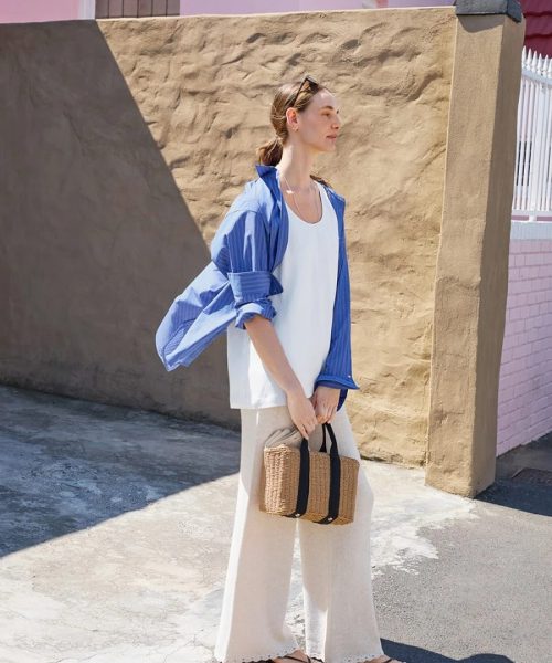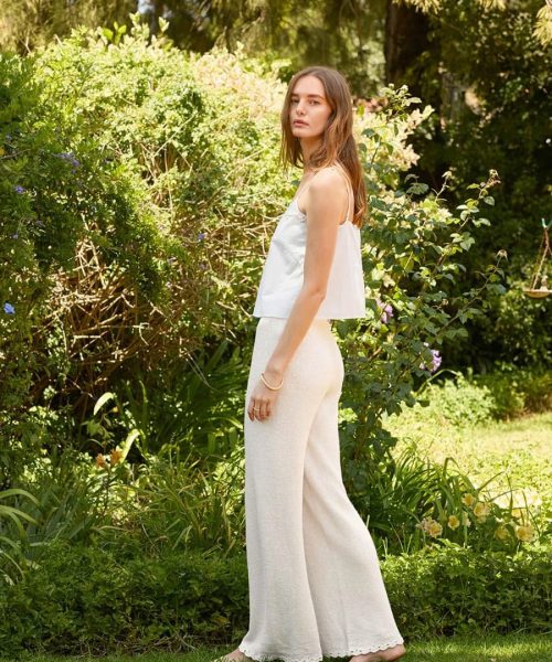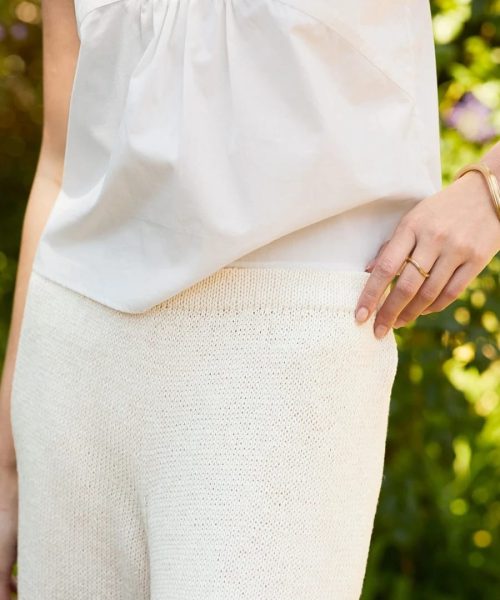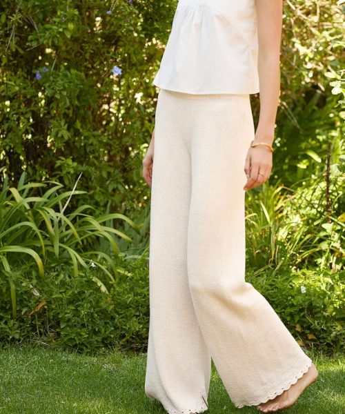 Bukse strikket ovenfra og ned i dobbel Tynn Line, med elastisk linning og heklet tungekant nederst.