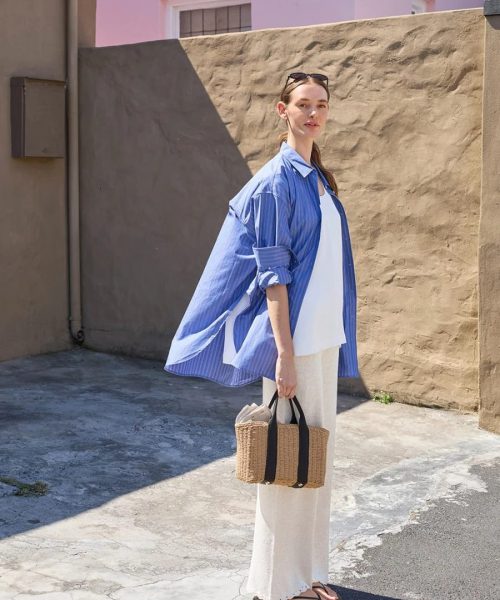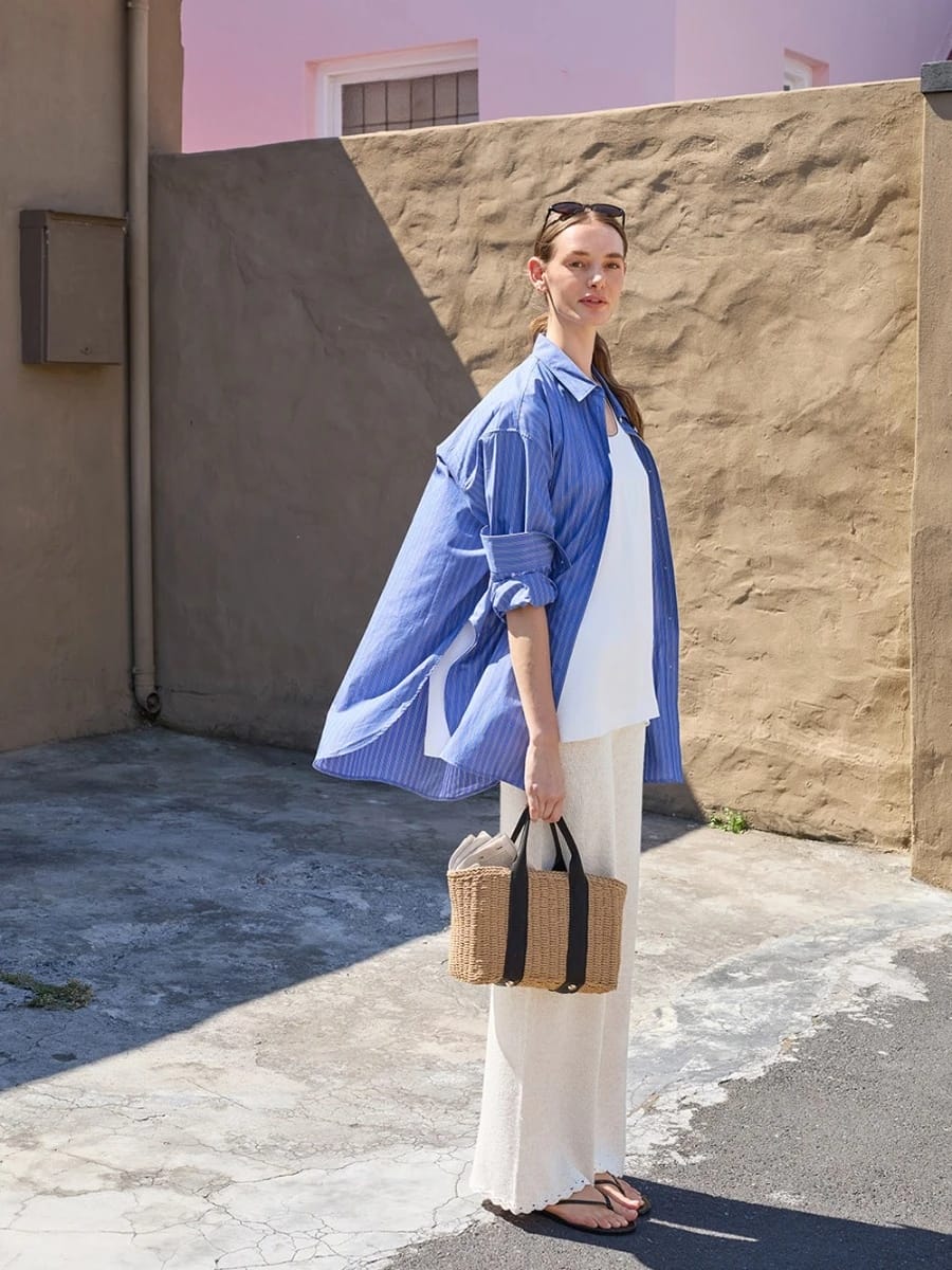 Buksen strikkes ovenfra og ned i glattstrikk med 2 tråder TYNN LINE. Velg gjerne 2 ulike farger i TYNN LINE for en melering. Det strikkes først en dobbel linning til å trekke en elastikk gjennom. Videre strikkes det vendepinner for å gjøre buksen høyere bak. Det økes masker midt foran og midt bak til kile før arbeidet deles, og hvert ben strikkes ferdig for seg. Under montering hekles det en tungekant rundt avfellingskanten nede på bena.
