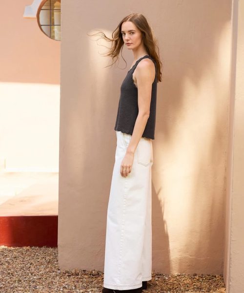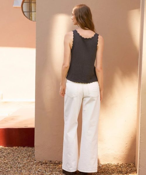 Toppen strikkes ovenfra og ned i glattstrikk med dobbel tråd TYNN LINE. Først legges det opp masker til høyre og venstre side av bakstykket, som strikkes hver for seg med økninger til hals. Delene strikkes sammen og det økes videre til ermehull. Deretter strikkes høyre og venstre side av forstykket på samme måte, men med dypere utringning. Arbeidet samles og strikkes rundt i glattstrikk, med økninger til A-fasong. Under montering hekles det 1 tungekant rundt avfellingskanten nede på toppen. Om det er ønskelig, kan det hekles i alt 5 tungekanter. Til slutt hekles det en omgang tungekant rundt ermehull og hals.
