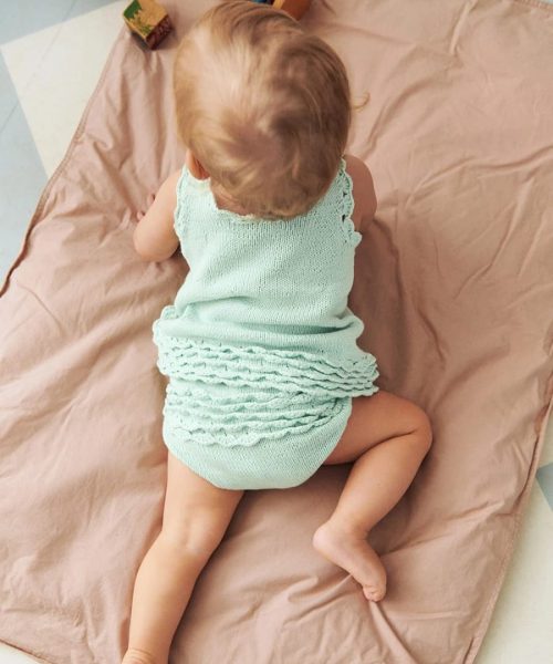 Bleiebukse strikket ovenfra og ned med dobbel linning, i-cord-kanter og heklede detaljer bak.