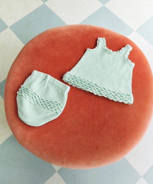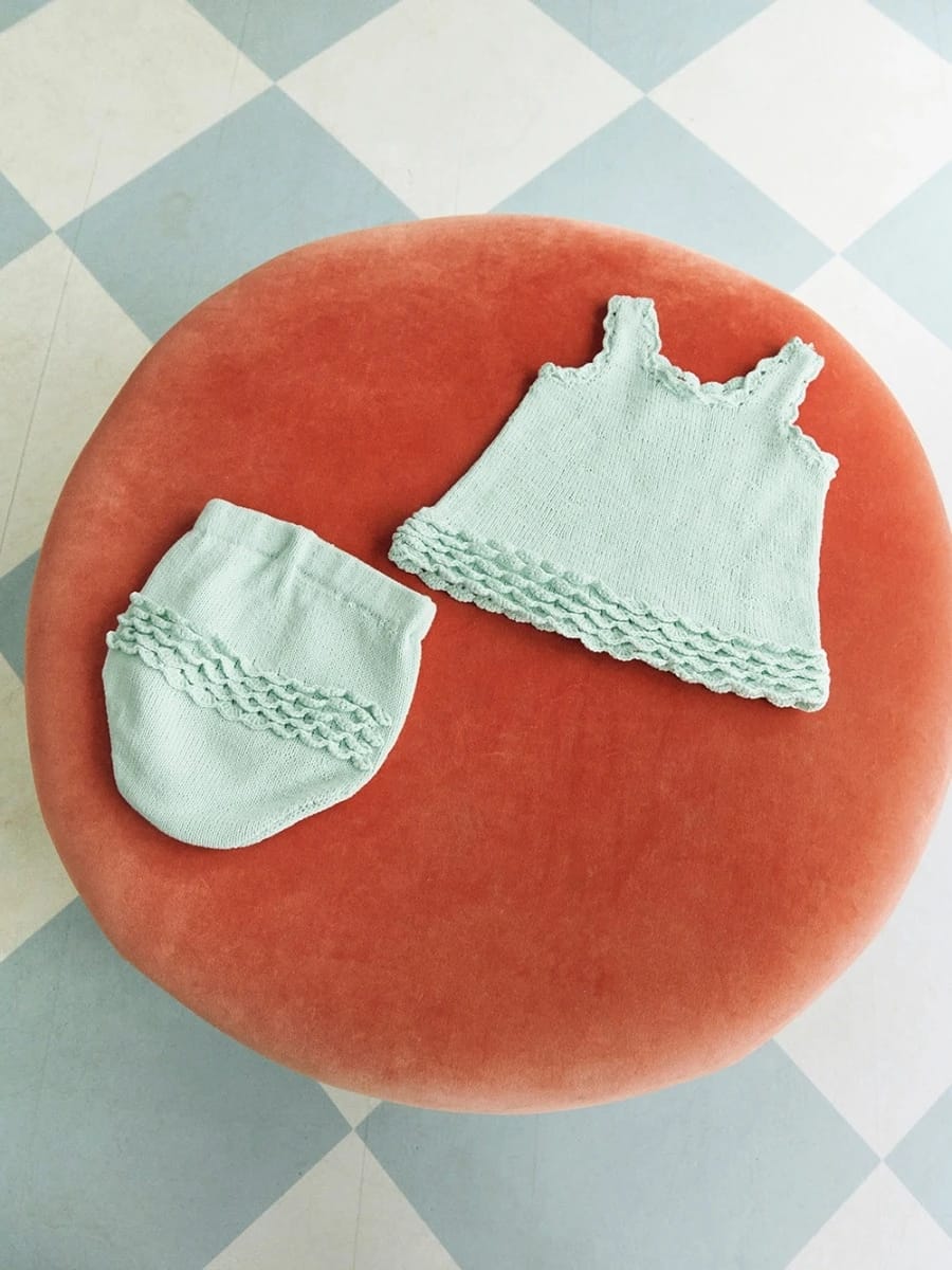 Oppskrift på Rosette Top Baby og Rosette Pants Baby medfølger.
