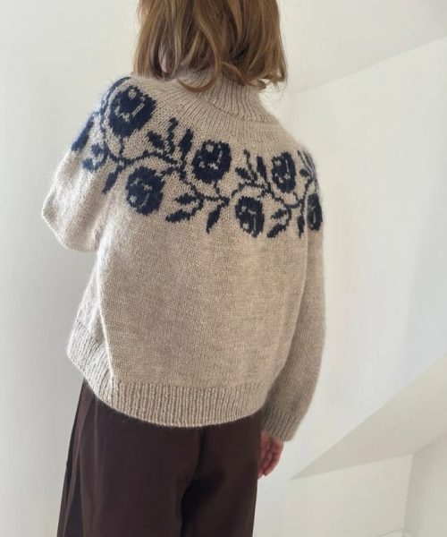 Rosie Yoke Sweater strikkes ovenfra, og roseborden strikkes inn i det runde bærestykket. Det betyr at alt mønster strikkes fra rettsiden, og dermed er lettere å strikke. Strikkes med 1 tråd Peer Gynt og 1 tråd Tynn Silk Mohair.