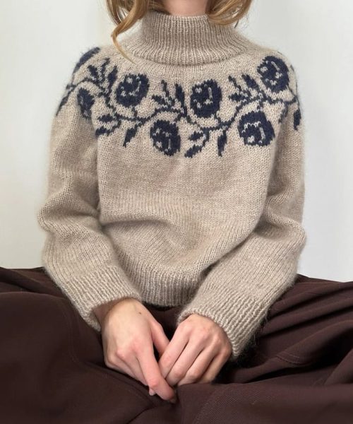 Rosie Yoke Sweater strikkes ovenfra, og roseborden strikkes inn i det runde bærestykket. Det betyr at alt mønster strikkes fra rettsiden, og dermed er lettere å strikke. Strikkes med 1 tråd Peer Gynt og 1 tråd Tynn Silk Mohair.