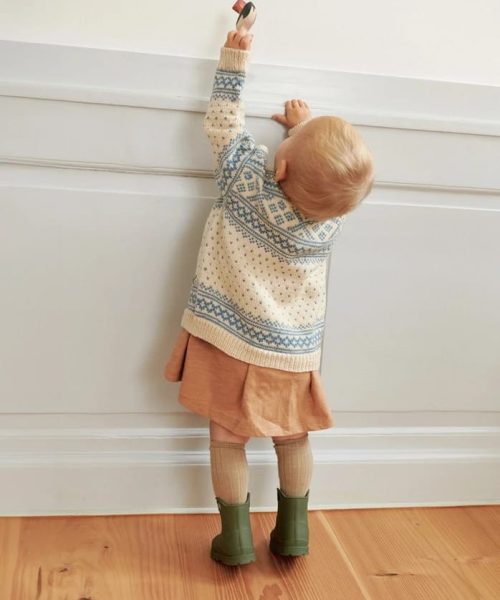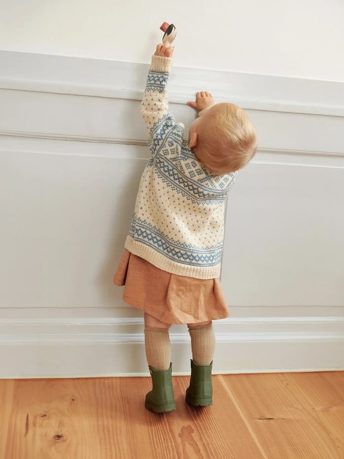 Setesdal kofte baby i Babyull Lanett er en tradisjonsrik kofte med fine lus og klassisk mønsterbord øverst. Den strikkes nedenfra og opp, og resultatet blir en varm og myk liten kofte med ekte norsk særpreg.