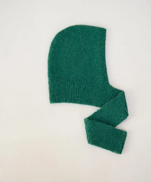 Videre legger man opp masker til halsen, som strikkes sammen med maskene fra hetten, og det strikkes rundt i vrangbord.