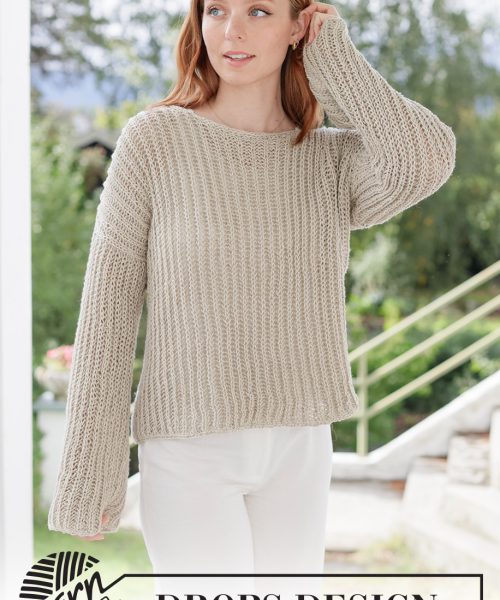 Strikket genser i DROPS Bomull-Lin. Arbeidet strikkes ovenfra og ned med helpatent og i-cord