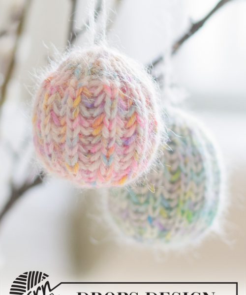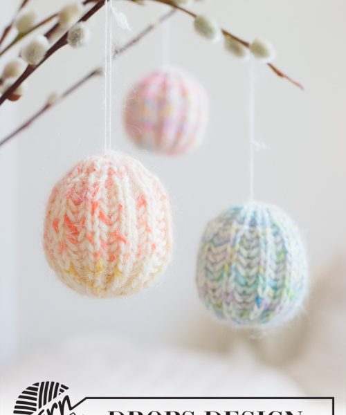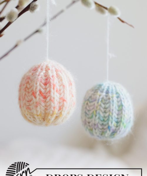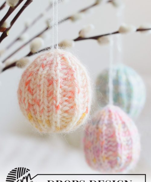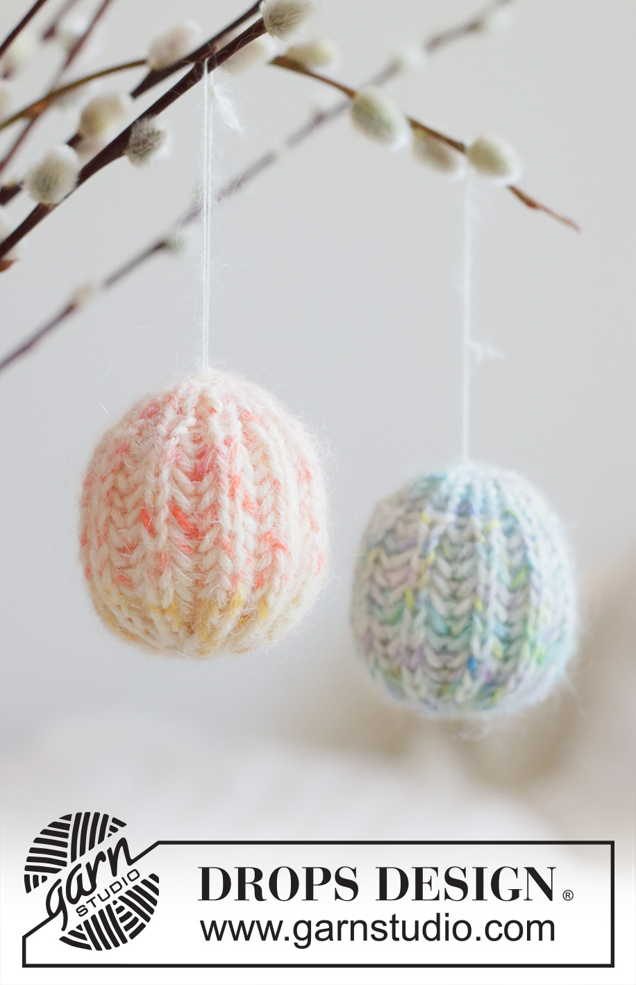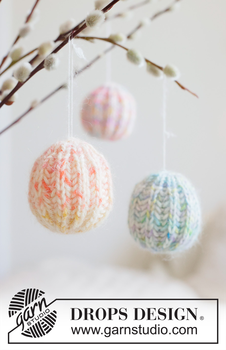 Strikkede påskeegg i DROPS Fiesta og DROPS Kid-Silk. Arbeidet strikkes rundt i helpatent.